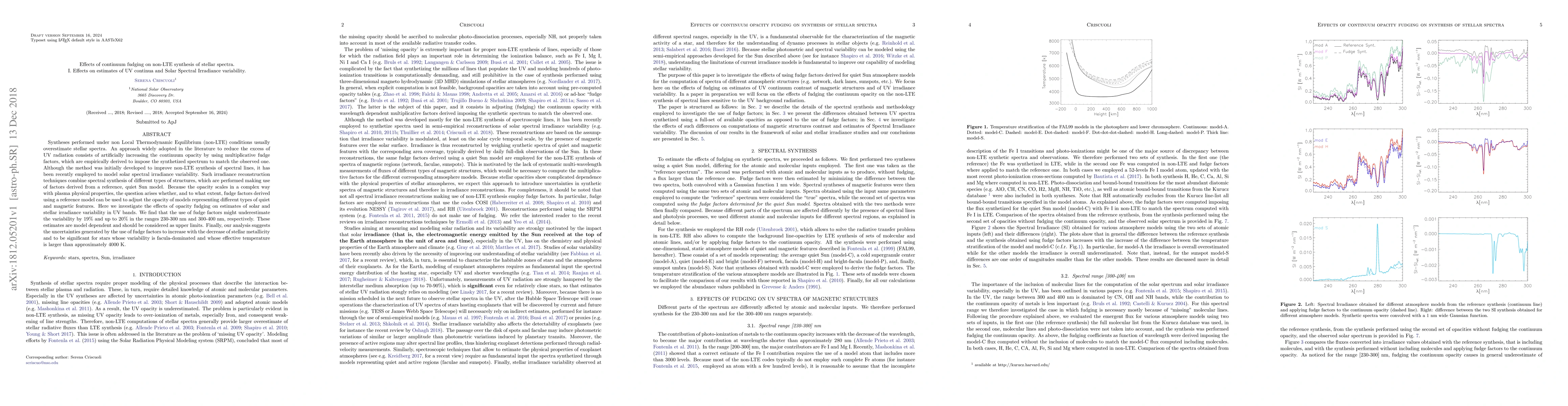 Synthesis performed under non Local Thermodynamic Equilibrium (non-LTE) conditions usually overestimate stellar spectra. An approach widely adopted in the literature to reduce the excess of UV radiation consists of artificially increasing the continuum opacity by using multiplicative fudge factors, which are empirically derived to impose the synthetized spectrum to match the observed one. Although the method was initially developed to improve non-LTE synthesis of spectral lines, it has been recently employed to model solar spectral irradiance variability. Such irradiance reconstruction techniques combine spectral synthesis of different types of structures, which are performed making use of factors derived from a reference, quiet Sun model. Because the opacity scales in a complex way with plasma physical properties, the question arises whether, and to what extent, fudge factors derived using a reference model can be used to adjust the opacity of models representing different types of quiet and magnetic features. Here we investigate the effects of opacity fudging on estimates of solar and stellar irradiance variability in UV bands. We find that the use of fudge factors might underestimate the variability by 19% and up to 20% in the ranges 230-300 nm and 300-400 nm, respectively. These estimates are model dependent and should be considered as upper limits. Finally, our analysis suggests the uncertainties generated by the use of fudge factors to increase with the decrease of stellar metallicity and to be significant for stars whose variability is facula-dominated and whose effective temperature is larger than approximately 4000 K.