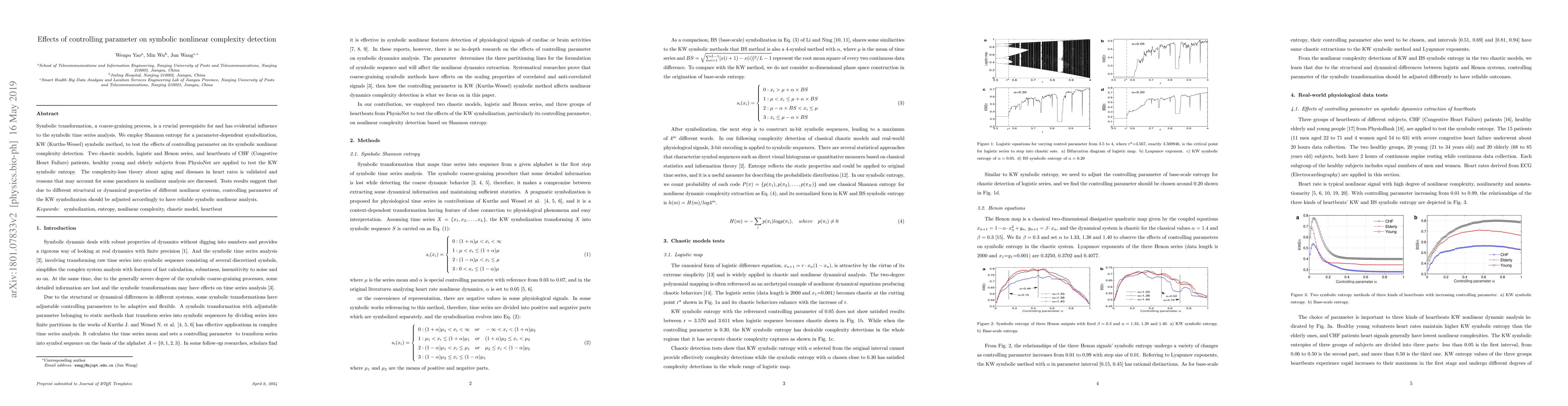 This study investigates how the controlling parameter in the KW symbolic method affects the detection of nonlinear complexity in symbolic time series. Results from logistic, Henon models, and heart rate data from various populations show that adjusting the parameter based on the system's properties is crucial for reliable complexity analysis, validating the complexity-loss theory in aging and heart failure.