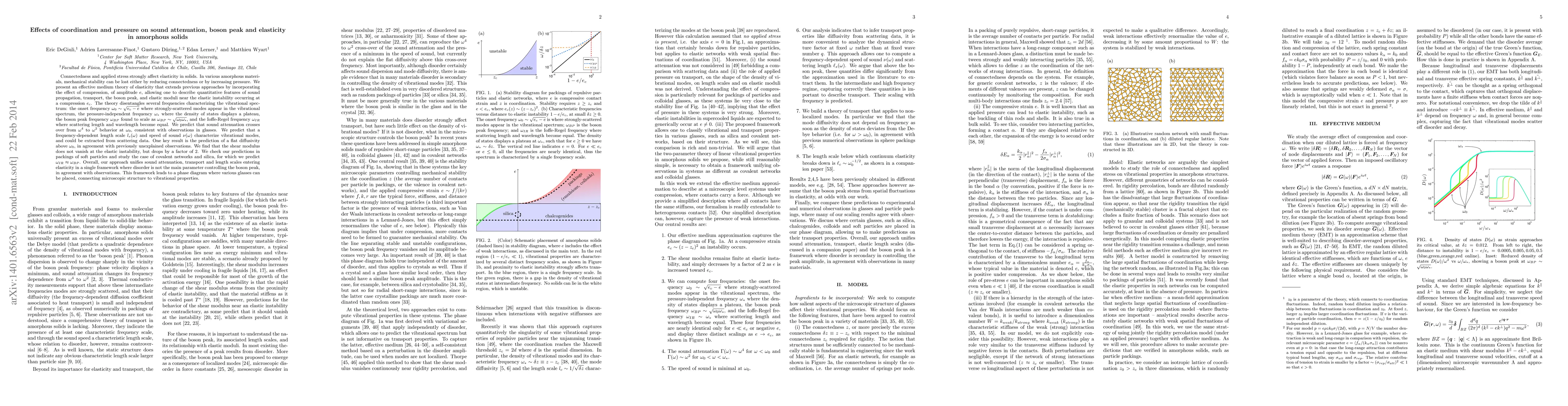 Connectedness and applied stress strongly affect elasticity in solids. In various amorphous solids, mechanical stability can be lost either by reducing connectedness or by increasing pressure. We present an effective medium theory of elasticity that extends previous approaches by incorporating the effect of compression, of amplitude $e$, allowing one to describe quantitative features of sound propagation, transport, the boson peak, and elastic moduli near the elastic instability occurring at a compression $e_c$. The theory disentangles several frequencies characterizing the vibrational spectrum: the onset frequency $\omega_0\sim \sqrt{e_c-e}$ where strongly-scattered modes appear in the vibrational spectrum, the pressure-independent frequency $\omega_*$ where the density of states displays a plateau, the boson peak frequency $\omega_{BP}$, and the Ioffe-Regel frequency $\omega_{IR}$ where scattering length and wavelength become equal. We predict that sound attenuation crosses over from $\omega^4$ to $\omega^2$ behaviour at $\omega_0$. We predict that a frequency-dependent length scale $l_s(\omega)$ and speed of sound $\nu(\omega)$ characterize vibrational modes, and could be extracted from scattering data. One key result is the prediction of a flat diffusivity above $\omega_0$, in agreement with previously unexplained observations. We find that the shear modulus does not vanish at the elastic instability, but drops by a factor of 2. We check our predictions in packings of soft particles and study the case of covalent networks and silica. Overall, our approach unifies sound attenuation, transport and length scales entering elasticity in a single framework where disorder is not the main parameter controlling the boson peak, in agreement with observations. This framework leads to a phase diagram where various glasses can be placed, connecting microscopic structure to vibrational properties.