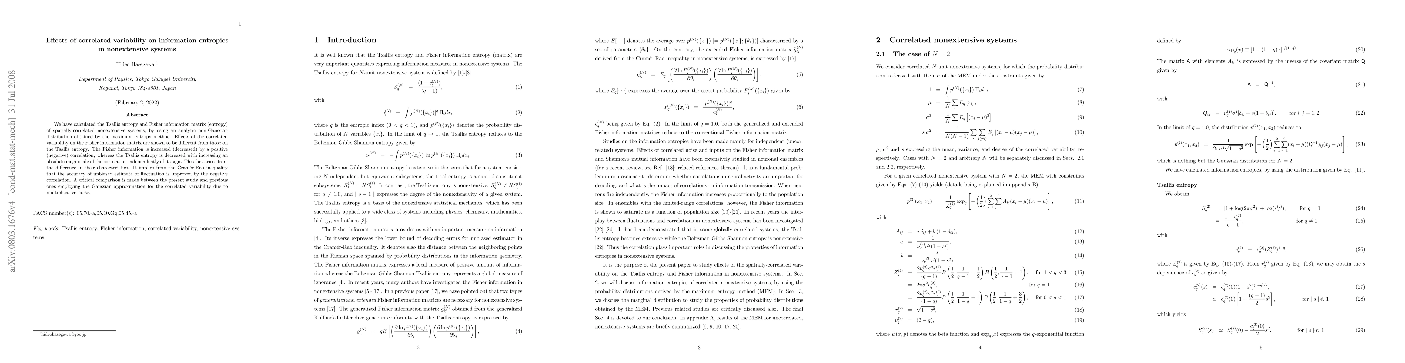 We have calculated the Tsallis entropy and Fisher information matrix (entropy) of spatially-correlated nonextensive systems, by using an analytic non-Gaussian distribution obtained by the maximum entropy method. Effects of the correlated variability on the Fisher information matrix are shown to be different from those on the Tsallis entropy. The Fisher information is increased (decreased) by a positive (negative) correlation, whereas the Tsallis entropy is decreased with increasing an absolute magnitude of the correlation independently of its sign. This fact arises from the difference in their characteristics. It implies from the Cram\'{e}r-Rao inequality that the accuracy of unbiased estimate of fluctuation is improved by the negative correlation. A critical comparison is made between the present study and previous ones employing the Gaussian approximation for the correlated variability due to multiplicative noise.