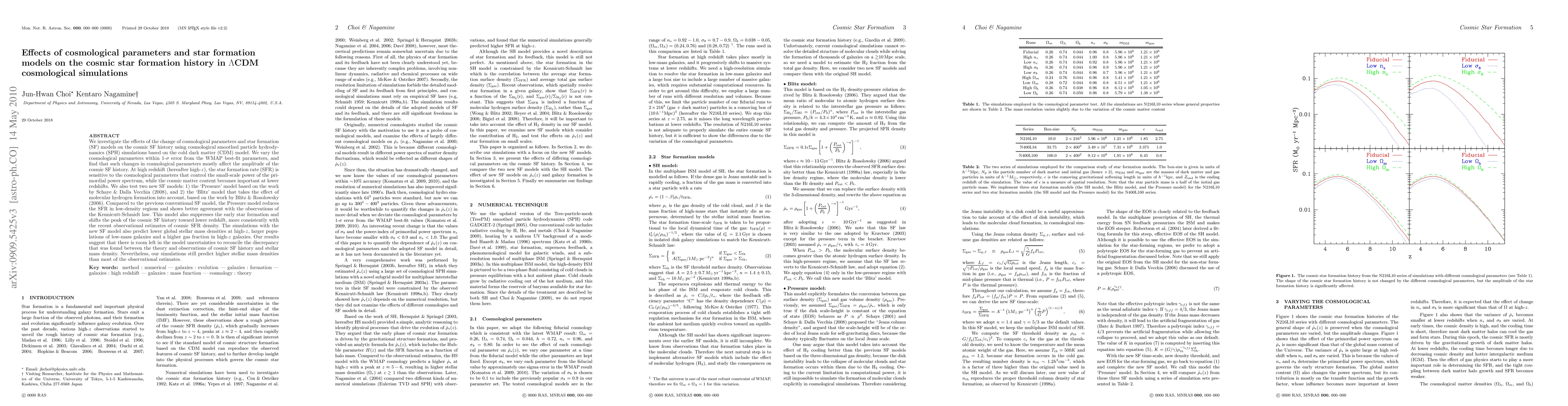 This paper examines how variations in cosmological parameters and star formation models impact the cosmic star formation history in LambdaCDM simulations. Changes in cosmological parameters mainly affect the amplitude of the star formation rate, with small-scale power influencing high-z SFRs. The new "Pressure" star formation model shows better observational agreement and predicts lower stellar mass densities at high-z, though it still overestimates observed stellar mass densities.