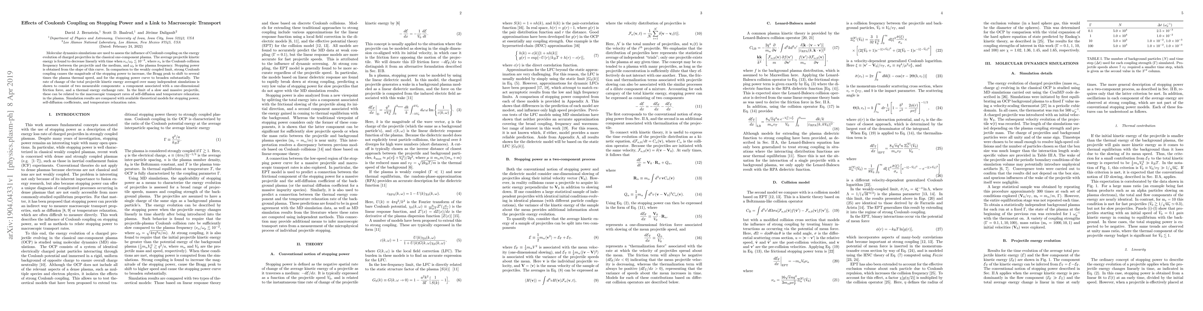 Molecular dynamics simulations are used to assess the influence of Coulomb coupling on the energy evolution of charged projectiles in the classical one-component plasma. The average projectile kinetic energy is found to decrease linearly with time when $\nu_{\alpha}/\omega_{p} \lesssim 10^{-2}$, where $\nu_{\alpha }$ is the Coulomb collision frequency between the projectile and the medium, and $\omega_{p}$ is the plasma frequency. Stopping power is obtained from the slope of this curve. In comparison to the weakly coupled limit, strong Coulomb coupling causes the magnitude of the stopping power to increase, the Bragg peak to shift to several times the plasma thermal speed, and for the stopping power curve to broaden substantially. The rate of change of the total projectile kinetic energy averaged over many independent simulations is shown to consist of two measurable components: a component associated with a one-dimensional friction force, and a thermal energy exchange rate. In the limit of a slow and massive projectile, these can be related to the macroscopic transport rates of self-diffusion and temperature relaxation in the plasma. Simulation results are compared with available theoretical models for stopping power, self-diffusion coefficients, and temperature relaxation rates.