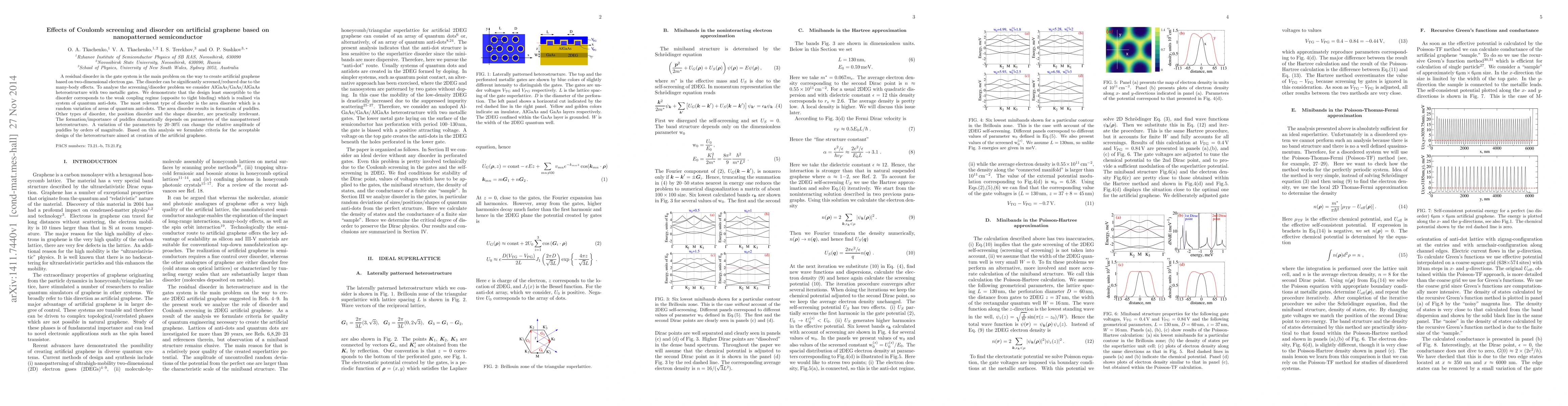 A residual disorder in the gate system is the main problem on the way to create artificial graphene based on two-dimensional electron gas. The disorder can be significantly screened/reduced due to the many-body effects. To analyse the screening/disorder problem we consider AlGaAs/GaAs/AlGaAs heterostructure with two metallic gates. We demonstrate that the design least susceptible to the disorder corresponds to the weak coupling regime (opposite to tight binding) which is realised via system of quantum anti-dots. The most relevant type of disorder is the area disorder which is a random variation of areas of quantum anti-dots. The area disorder results in formation of puddles. Other types of disorder, the position disorder and the shape disorder, are practically irrelevant. The formation/importance of puddles dramatically depends on parameters of the nanopatterned heterostructure. A variation of the parameters by 20--30\% can change the relative amplitude of puddles by orders of magnitude. Based on this analysis we formulate criteria for the acceptable design of the heterostructure aimed at creation of the artificial graphene.