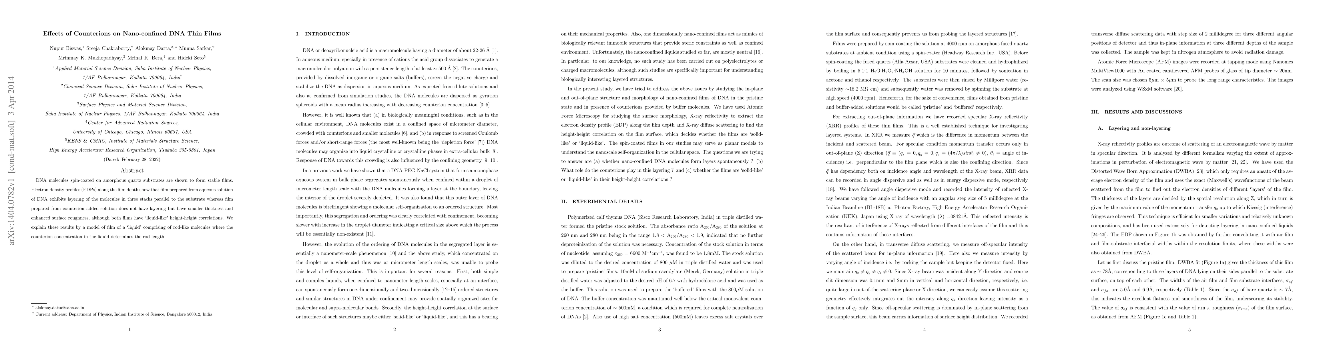 DNA molecules spin-coated on amorphous quartz substrates are shown to form stable films. Electron density profiles (EDPs) along the film depth show that film prepared from aqueous solution of DNA exhibits layering of the molecules in three stacks parallel to the substrate whereas film prepared from counterion added solution does not have layering but have smaller thickness and enhanced surface roughness, although both films have 'liquid-like' height-height correlations. We explain these results by a model of film of a 'liquid' comprising of rod-like molecules where the counterion concentration in the liquid determines the rod length.