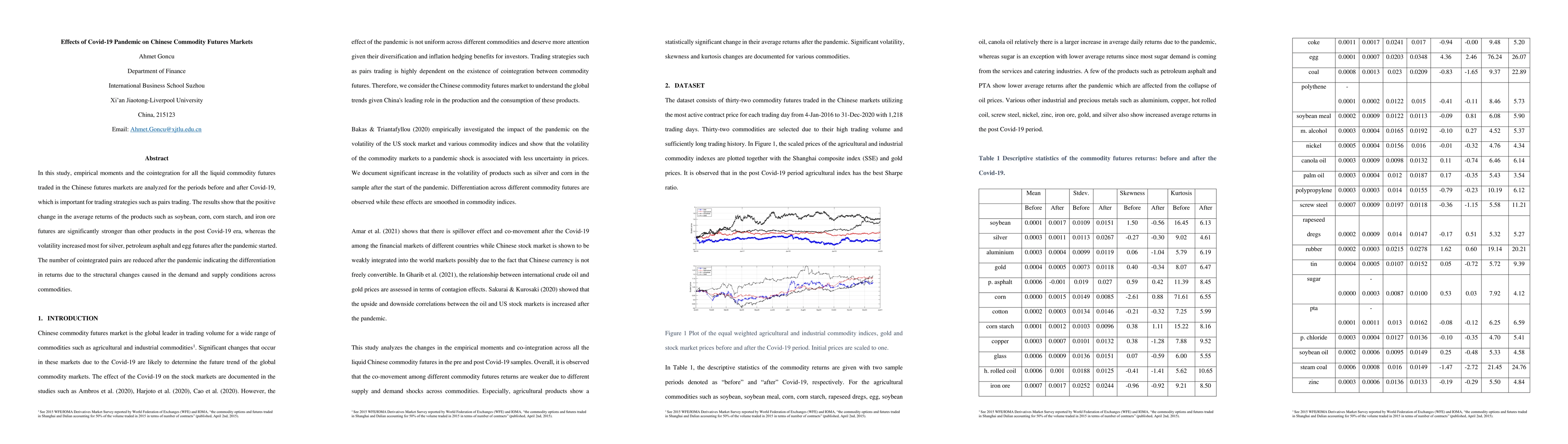 In this study, empirical moments and the cointegration for all the liquid commodity futures traded in the Chinese futures markets are analyzed for the periods before and after Covid-19, which is important for trading strategies such as pairs trading. The results show that the positive change in the average returns of the products such as soybean, corn, corn starch, and iron ore futures are significantly stronger than other products in the post Covid-19 era, whereas the volatility increased most for silver, petroleum asphalt and egg futures after the pandemic started. The number of cointegrated pairs are reduced after the pandemic indicating the differentiation in returns due to the structural changes caused in the demand and supply conditions across commodities.