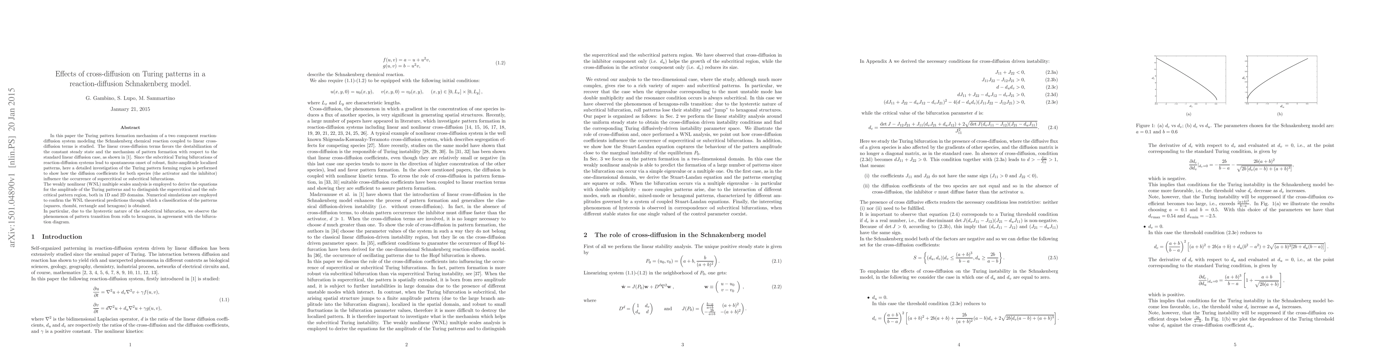 This paper investigates the impact of cross-diffusion on Turing pattern formation in a two-component reaction-diffusion system modeled by the Schnakenberg model, revealing how cross-diffusion destabilizes the steady state and influences pattern formation. The study employs weakly nonlinear analysis to classify patterns and confirms theoretical predictions with numerical simulations, showing pattern transitions due to subcritical bifurcation.