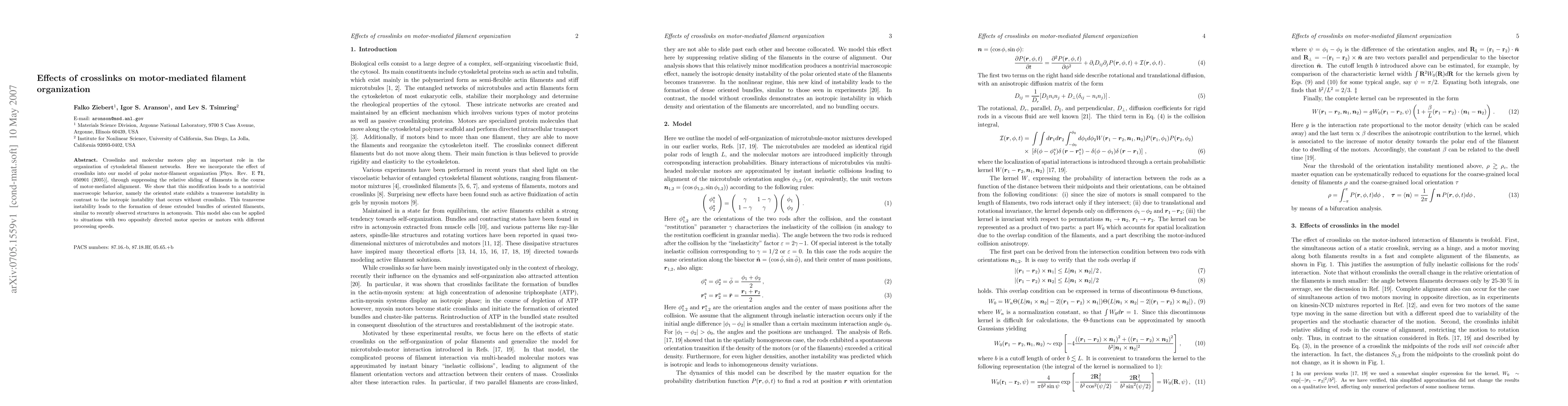 This study models the impact of crosslinks on motor-mediated organization of cytoskeletal filaments, revealing that crosslinks suppress filament sliding and induce a transverse instability, leading to dense filament bundles. This behavior mirrors recent observations in actomyosin structures.