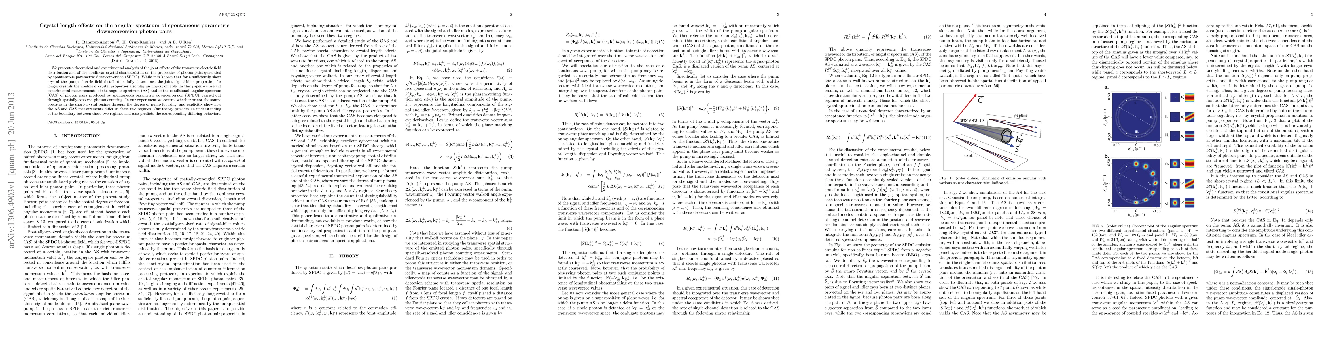 This paper investigates the impact of crystal length on the angular spectrum of photon pairs generated via spontaneous parametric downconversion. It combines theoretical analysis with experimental measurements to demonstrate how crystal properties influence the angular distribution when the crystal length exceeds the regime where pump electric field alone governs the pair properties.