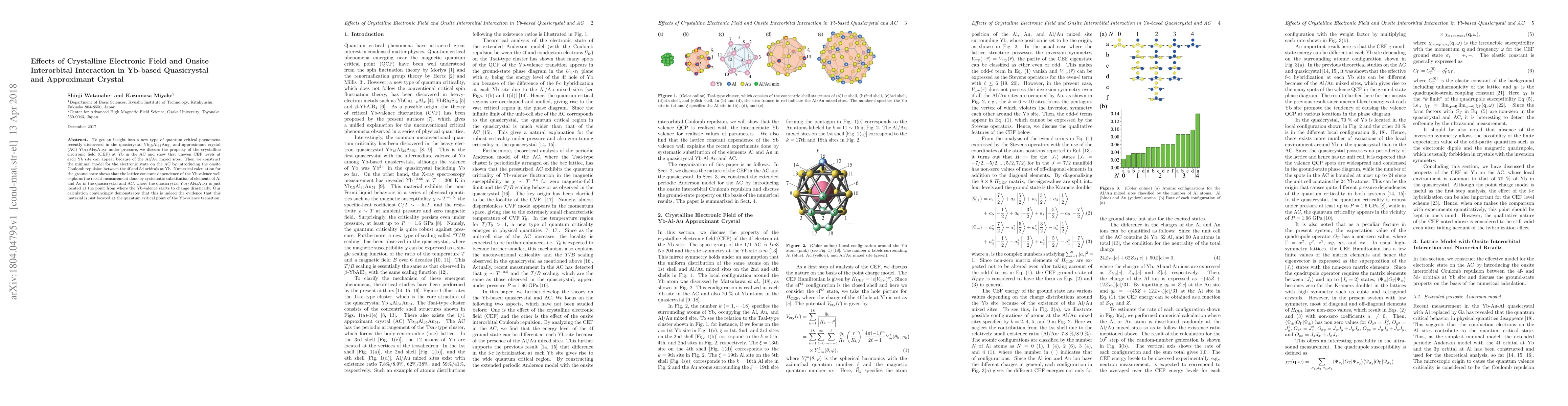 This paper investigates the crystalline electronic field (CEF) effects and onsite interorbital interaction in Yb-based quasicrystals and approximant crystals under pressure, revealing that the mixed Al/Au sites cause uneven CEF levels. The study constructs a minimal model incorporating onsite Coulomb repulsion, showing that the Yb valence transition near the quantum critical point is explained by the lattice constant dependence.
