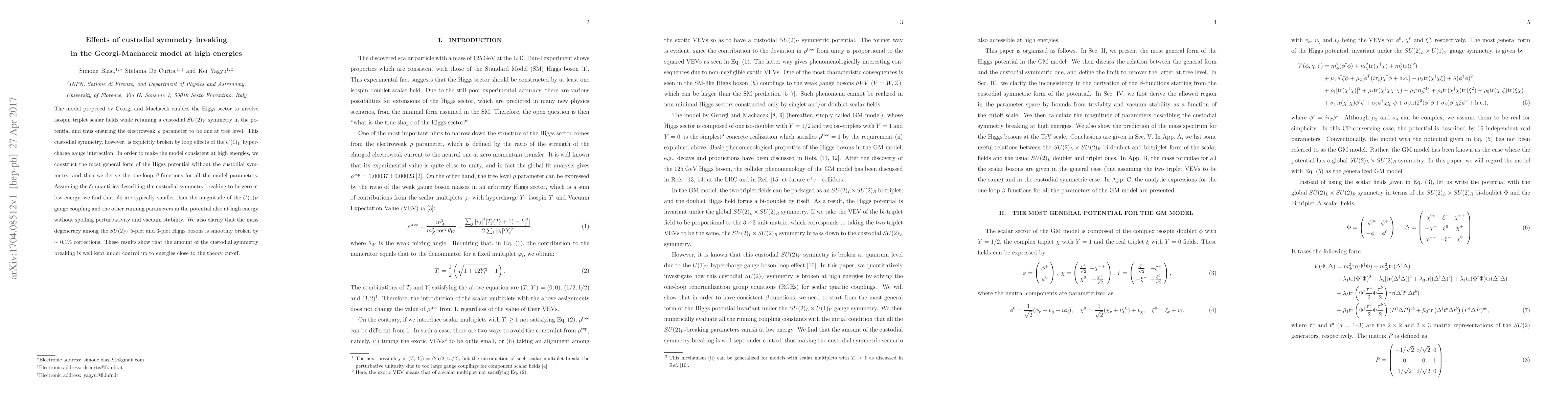This paper investigates the effects of custodial symmetry breaking in the Georgi-Machacek model at high energies, constructing the most general Higgs potential without custodial symmetry. The study finds that the symmetry breaking remains manageable, with corrections under 0.1% and parameters maintaining perturbativity and vacuum stability.