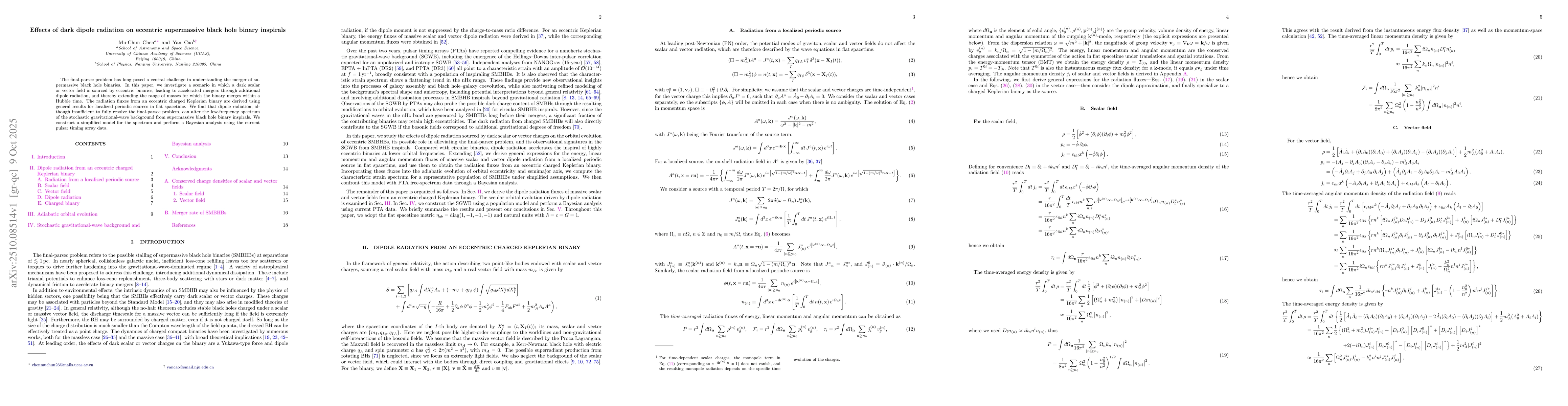 The final-parsec problem has long posed a central challenge in understanding the merger of supermassive black hole binaries. In this paper, we investigate a scenario in which a dark scalar or vector field is sourced by eccentric binaries, leading to accelerated mergers through additional dipole radiation, and thereby extending the range of masses for which the binary merges within a Hubble time. The radiation fluxes from an eccentric charged Keplerian binary are derived using general results for localized periodic sources in flat spacetime. We find that dipole radiation, although insufficient to fully resolve the final-parsec problem, can alter the low-frequency spectrum of the stochastic gravitational-wave background from supermassive black hole binary inspirals. We construct a simplified model for the spectrum and perform a Bayesian analysis using the current pulsar timing array data.