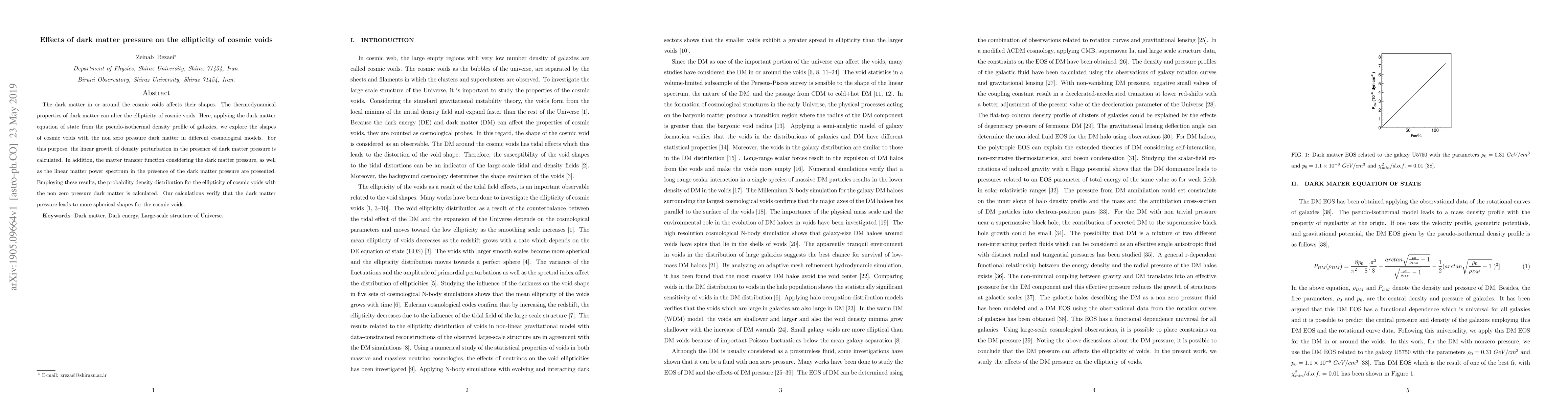 This paper investigates how dark matter pressure influences the ellipticity of cosmic voids, finding that non-zero pressure dark matter tends to make voids more spherical. The study uses the pseudo-isothermal density profile and calculates the linear growth of density perturbations, matter transfer function, and linear matter power spectrum considering dark matter pressure.