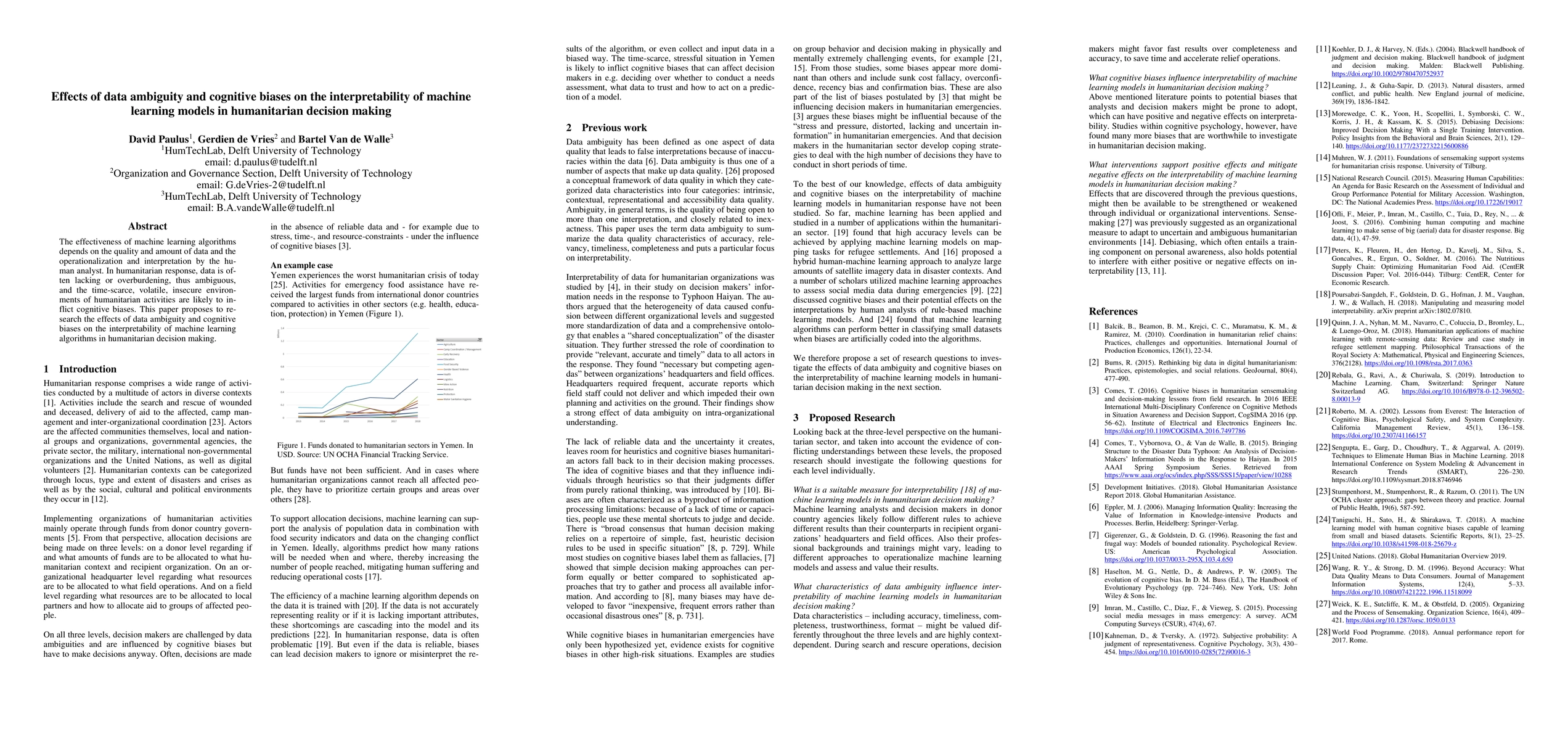 The effectiveness of machine learning algorithms depends on the quality and amount of data and the operationalization and interpretation by the human analyst. In humanitarian response, data is often lacking or overburdening, thus ambiguous, and the time-scarce, volatile, insecure environments of humanitarian activities are likely to inflict cognitive biases. This paper proposes to research the effects of data ambiguity and cognitive biases on the interpretability of machine learning algorithms in humanitarian decision making.