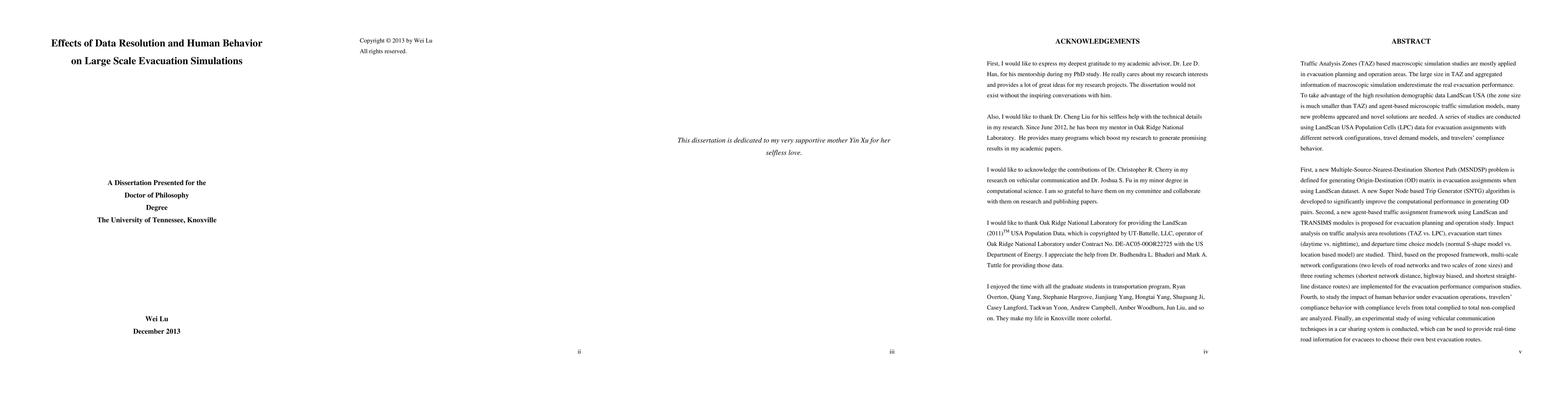 This paper explores the impact of data resolution and human behavior on large-scale evacuation simulations using high-resolution demographic data and agent-based microscopic traffic models. It proposes a new evacuation assignment framework and analyzes the effects of different network configurations, travel demand models, and travelers' compliance behavior on evacuation performance.