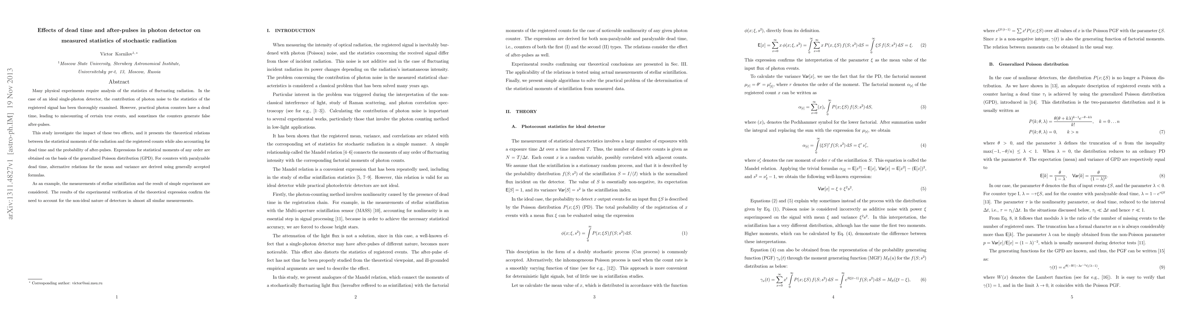 Many physical experiments require analysis of the statistics of fluctuating radiation. In the case of an ideal single-photon detector, the contribution of photon noise to the statistics of the registered signal has been thoroughly examined. However, practical photon counters have a dead time, leading to miscounting of certain true events, and sometimes the counters generate false after-pulses. This study investigate the impact of these two effects, and it presents the theoretical relations between the statistical moments of the radiation and the registered counts while also accounting for dead time and the probability of after-pulses. Expressions for statistical moments of any order are obtained on the basis of the generalized Poisson distribution (GPD). For counters with paralyzable dead time, alternative relations for the mean and variance are derived using generally accepted formulas. As an example, the measurements of stellar scintillation and the result of simple experiment are considered. The results of the experimental verification of the theoretical expression confirm the need to account for the non-ideal nature of detectors in almost all similar measurements.
