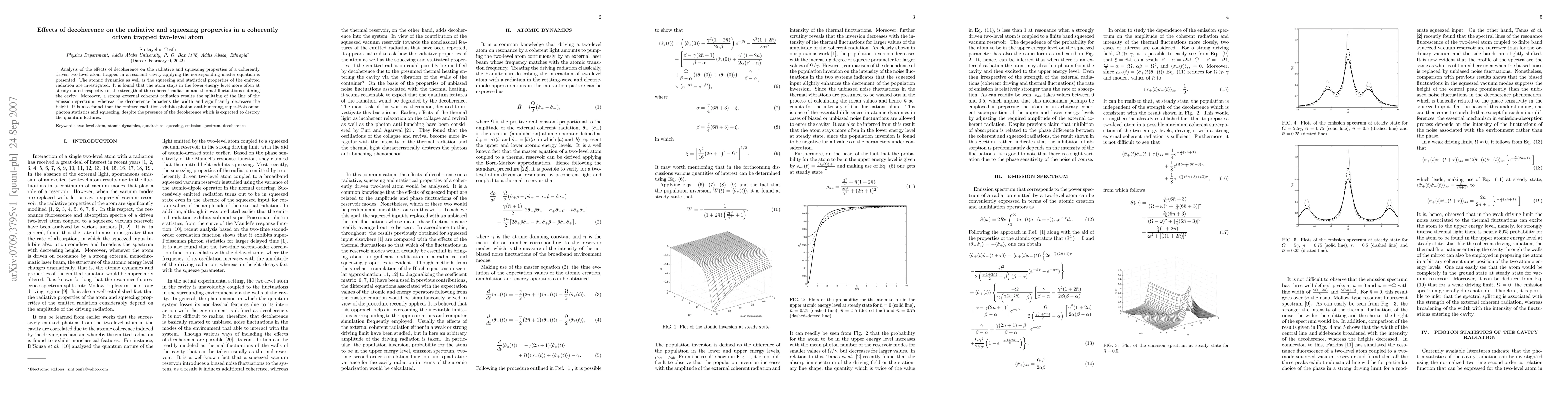This paper investigates how decoherence influences the radiative and squeezing properties of a coherently driven two-level atom in a resonant cavity. Despite decoherence, the atom often remains in the lower energy level, and strong coherent radiation causes spectral line splitting, while decoherence broadens the spectrum and reduces its height. The emitted radiation shows photon anti-bunching, super-Poissonian statistics, and squeezing, defying the expected loss of quantum features due to decoherence.