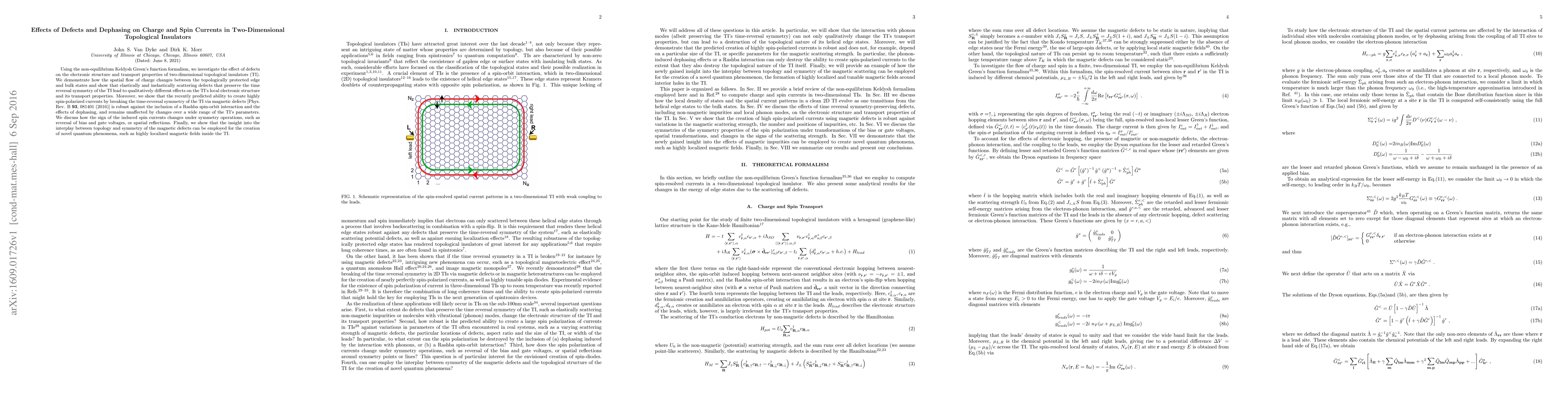 This paper investigates the impact of defects and dephasing on charge and spin currents in two-dimensional topological insulators, revealing distinct effects from elastic and inelastic scattering. It demonstrates that spin-polarized currents remain robust despite spin-orbit interactions and dephasing, and explores the creation of novel quantum phenomena via magnetic defects.