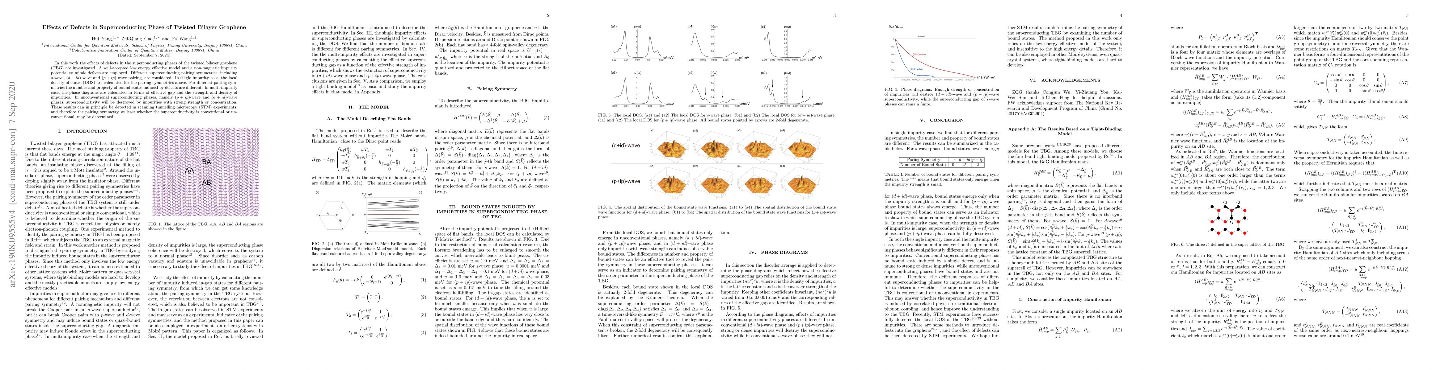 This study investigates the impact of defects on superconducting phases in twisted bilayer graphene using an effective low-energy model and non-magnetic impurity potentials. It reveals that different superconducting pairing symmetries exhibit varying numbers and properties of bound states induced by defects, with unconventional pairings being more susceptible to destruction by impurities.