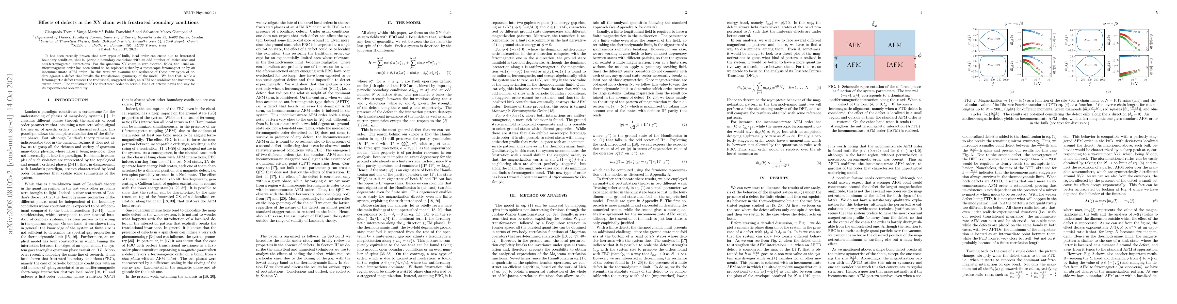 It has been recently proven that new types of bulk, local order can ensue due to frustrated boundary condition, that is, periodic boundary conditions with an odd number of lattice sites and anti-ferromagnetic interactions. For the quantum XY chain in zero external fields, the usual antiferromagnetic order has been found to be replaced either by a mesoscopic ferromagnet or by an incommensurate AFM order. In this work we examine the resilience of these new types of orders against a defect that breaks the translational symmetry of the model. We find that, while a ferromagnetic defect restores the traditional, staggered order, an AFM one stabilizes the incommensurate order. The robustness of the frustrated order to certain kinds of defects paves the way for its experimental observability.