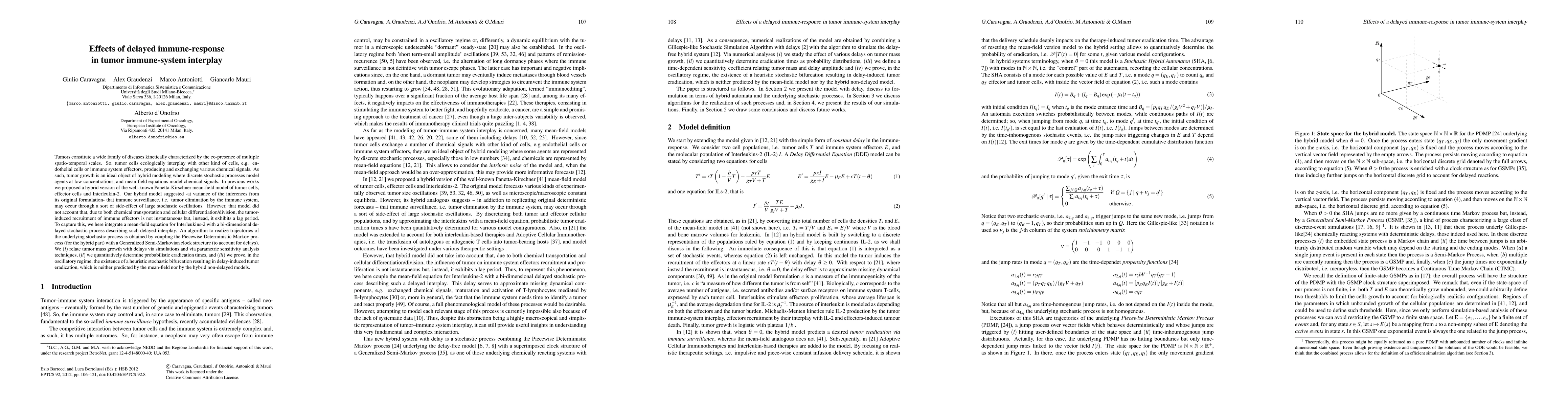 This paper proposes a hybrid model integrating delayed stochastic processes and mean-field equations to study tumor-immune system interactions, revealing that delayed immune response can lead to tumor eradication through stochastic oscillations, a phenomenon not predicted by non-delayed models. The study employs a novel algorithm combining Piecewise Deterministic Markov processes and Generalized Semi-Markovian clocks to simulate and analyze the effects of delays on tumor growth.