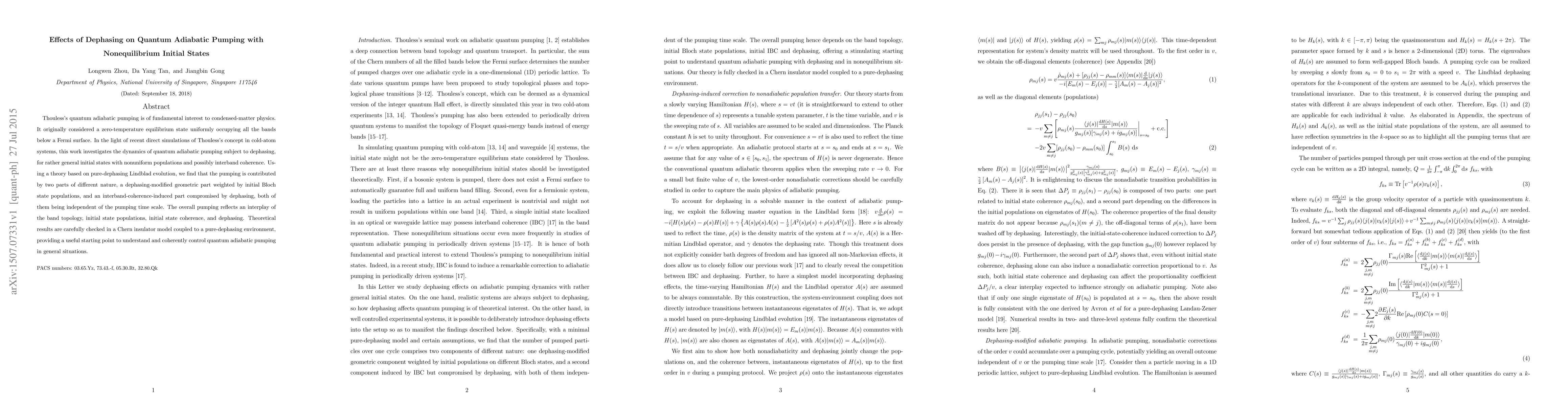 Thouless's quantum adiabatic pumping is of fundamental interest to condensed-matter physics. It originally considered a zero-temperature equilibrium state uniformly occupying all the bands below a Fermi surface. In the light of recent direct simulations of Thouless's concept in cold-atom systems, this work investigates the dynamics of quantum adiabatic pumping subject to dephasing, for rather general initial states with nonuniform populations and possibly interband coherence. Using a theory based on pure-dephasing Lindblad evolution, we find that the pumping is contributed by two parts of different nature, a dephasing-modified geometric part weighted by initial Bloch state populations, and an interband-coherence-induced part compromised by dephasing, both of them being independent of the pumping time scale. The overall pumping reflects an interplay of the band topology, initial state populations, initial state coherence, and dephasing. Theoretical results are carefully checked in a Chern insulator model coupled to a pure-dephasing environment, providing a useful starting point to understand and coherently control quantum adiabatic pumping in general situations.