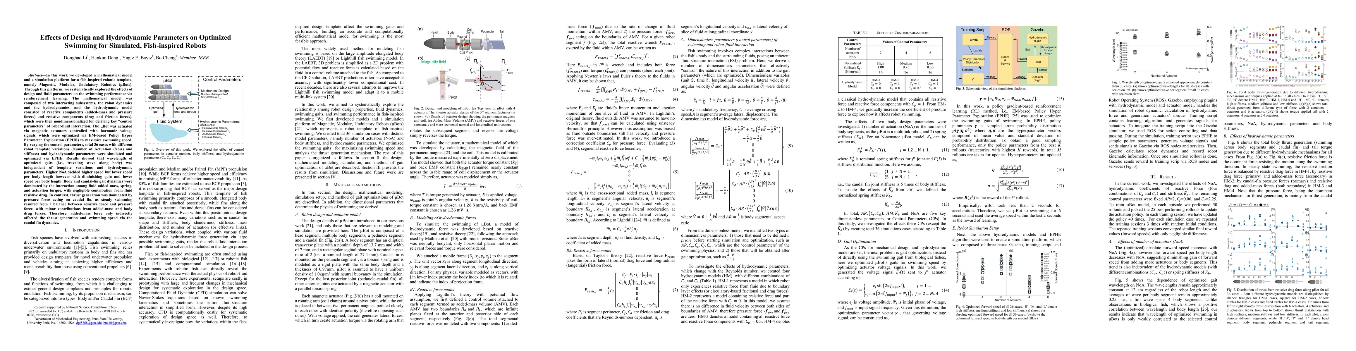 In this work we developed a mathematical model and a simulation platform for a fish-inspired robotic template, namely Magnetic, Modular, Undulatory Robotics ($\mu$Bots). Through this platform, we systematically explored the effects of design and fluid parameters on the swimming performance via reinforcement learning. The mathematical model was composed of two interacting subsystems, the robot dynamics and the hydrodynamics, and the hydrodynamic model consisted of reactive components (added-mass and pressure forces) and resistive components (drag and friction forces), which were then nondimensionalized for deriving key "control parameters" of robot-fluid interaction. The $\mu$Bot was actuated via magnetic actuators controlled with harmonic voltage signals, which were optimized via EM-based Policy Hyper Parameter Exploration (EPHE) to maximize swimming speed. By varying the control parameters, total 36 cases with different robot template variations (Number of Actuation (NoA) and stiffness) and hydrodynamic parameters were simulated and optimized via EPHE. Results showed that wavelength of optimized gaits (i.e., traveling wave along body) was independent of template variations and hydrodynamic parameters. Higher NoA yielded higher speed but lower speed per body length however with diminishing gain and lower speed per body length. Body and caudal-fin gait dynamics were dominated by the interaction among fluid added-mass, spring, and actuation torque, with negligible contribution from fluid resistive drag. In contrast, thrust generation was dominated by pressure force acting on caudal fin, as steady swimming resulted from a balance between resistive force and pressure force, with minor contributions from added-mass and body drag forces. Therefore, added-mass force only indirectly affected the thrust generation and swimming speed via the caudal fin dynamics.