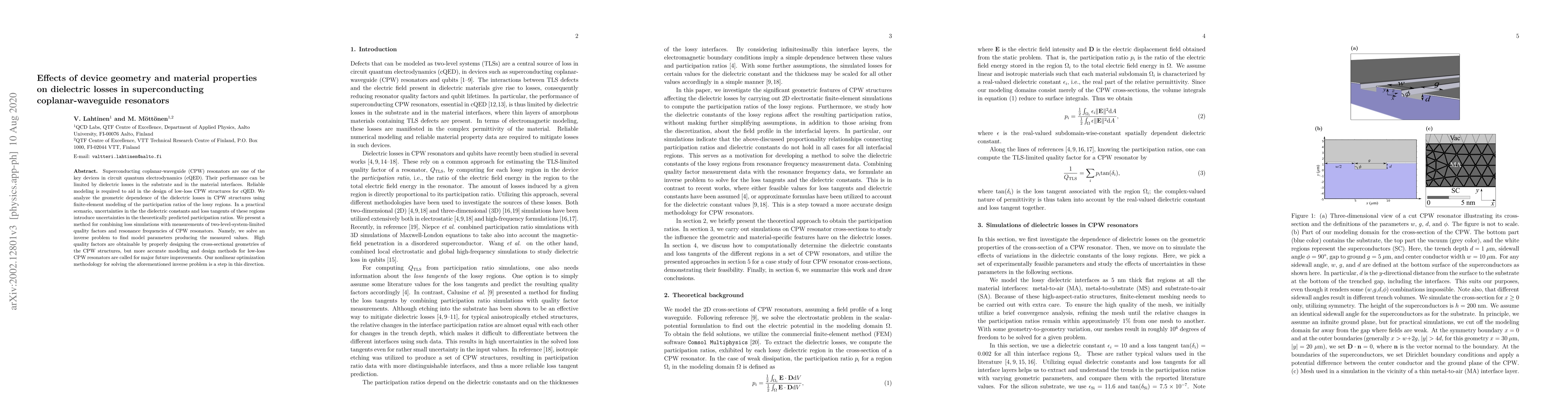 This paper investigates the impact of device geometry and material properties on dielectric losses in superconducting coplanar-waveguide resonators, employing finite-element modeling and inverse problem solving to optimize design for low-loss structures in circuit quantum electrodynamics. Future improvements require more accurate modeling and design methods.