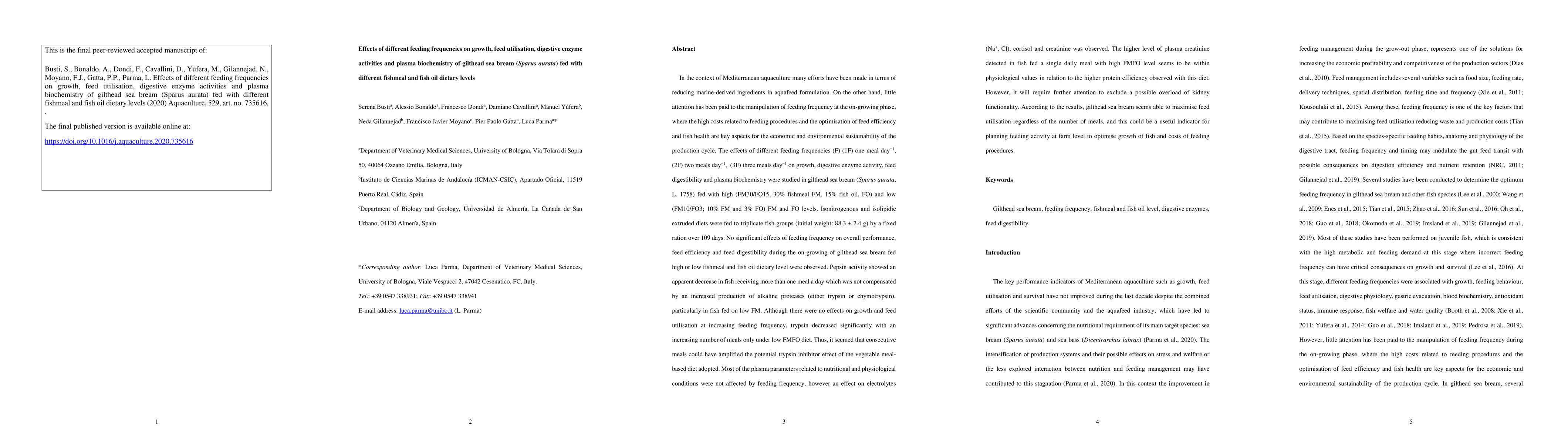In the context of Mediterranean aquaculture little attention has been paid to the manipulation of feeding frequency at the on-growing phase. The effects of different feeding frequencies: one meal per day, two meals per day, three meals per day on growth, digestive enzyme activity, feed digestibility and plasma biochemistry were studied in gilthead sea bream (Sparus aurata, L. 1758) fed with high and low fishmeal and fish oil levels. Isonitrogenous and isolipidic extruded diets were fed to triplicate fish groups by a fixed ration over 109 days. No significant effects of feeding frequency on overall performance, feed efficiency and feed digestibility during the on-growing of gilthead sea bream fed high or low fishmeal and fish oil dietary level were observed. Pepsin activity showed an apparent decrease in fish receiving more than one meal a day which was not compensated by an increased production of alkaline proteases particularly in fish fed on low FM. Although there were no effects on growth and feed utilisation at increasing feeding frequency, trypsin decreased significantly with an increasing number of meals only under low FMFO diet. Thus, it seemed that consecutive meals could have amplified the potential trypsin inhibitor effect of the vegetable meal-based diet adopted. Results of the plasma parameters related to nutritional and physiological conditions were not affected by feeding frequency. The higher level of plasma creatinine detected in fish fed a single daily meal with high FMFO level seems to be within physiological values in relation to the higher protein efficiency observed with this diet. According to the results, gilthead sea bream seems able to maximise feed utilisation regardless of the number of meals, and this could be a useful indicator for planning feeding activity at farm level to optimise growth of fish and costs of feeding procedures.