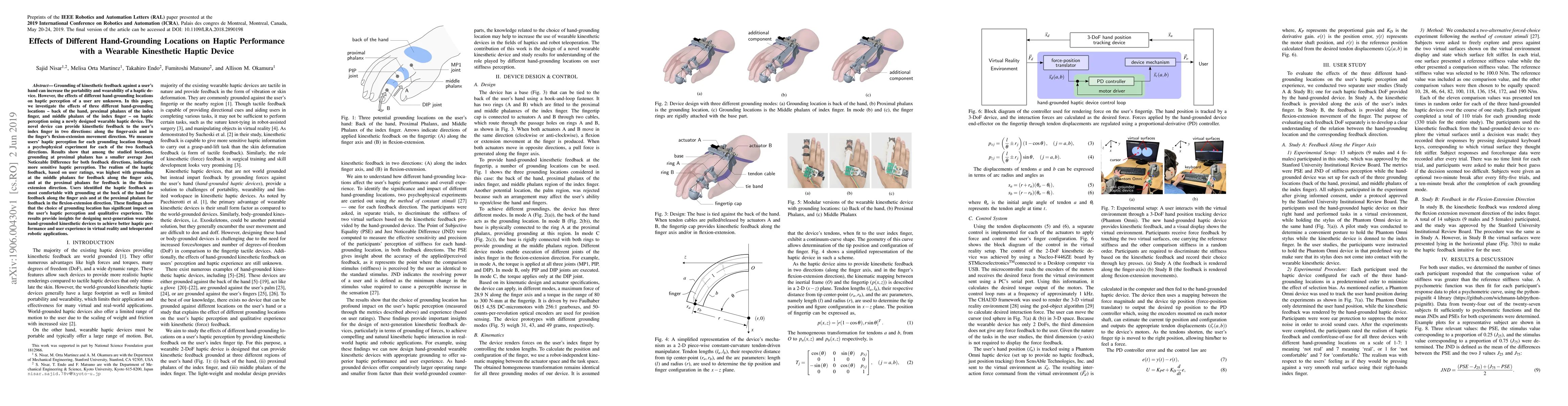 This study investigates how different hand-grounding locations affect haptic perception with a wearable kinesthetic device. Results show that grounding at the proximal phalanx of the index finger provides the most sensitive haptic perception, while grounding at the middle phalanx offers the highest realism and comfort varies based on the feedback direction.