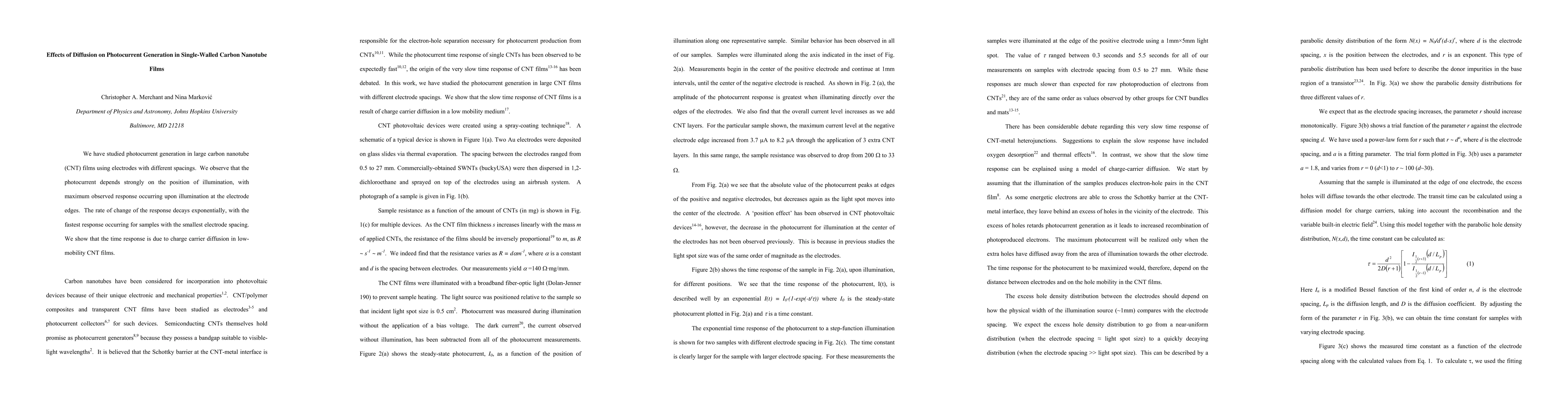 This study investigates photocurrent generation in large single-walled carbon nanotube films, finding that maximum response occurs at electrode edges due to charge carrier diffusion. The fastest response is observed in samples with the smallest electrode spacing, indicating the influence of diffusion on photocurrent dynamics.