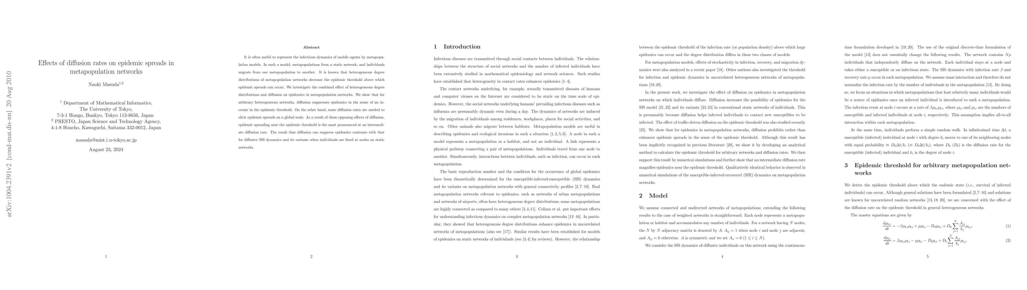 This paper examines how diffusion rates influence epidemic spread in metapopulation networks, finding that diffusion generally increases the epidemic threshold but that intermediate diffusion rates maximize epidemic spreading near the threshold. Contrary to static network models, diffusion can suppress epidemics in metapopulation networks.