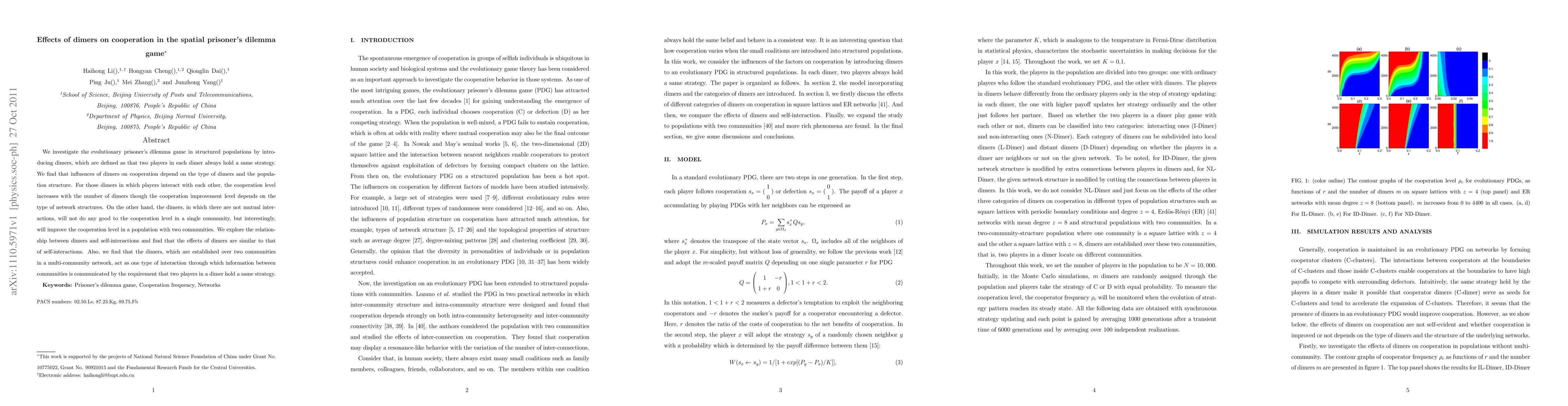 We investigate the evolutionary prisoner's dilemma game in structured populations by introducing dimers, which are defined as that two players in each dimer always hold a same strategy. We find that influences of dimers on cooperation depend on the type of dimers and the population structure. For those dimers in which players interact with each other, the cooperation level increases with the number of dimers though the cooperation improvement level depends on the type of network structures. On the other hand, the dimers, in which there are not mutual interactions, will not do any good to the cooperation level in a single community, but interestingly, will improve the cooperation level in a population with two communities. We explore the relationship between dimers and self-interactions and find that the effects of dimers are similar to that of self-interactions. Also, we find that the dimers, which are established over two communities in a multi-community network, act as one type of interaction through which information between communities is communicated by the requirement that two players in a dimer hold a same strategy.