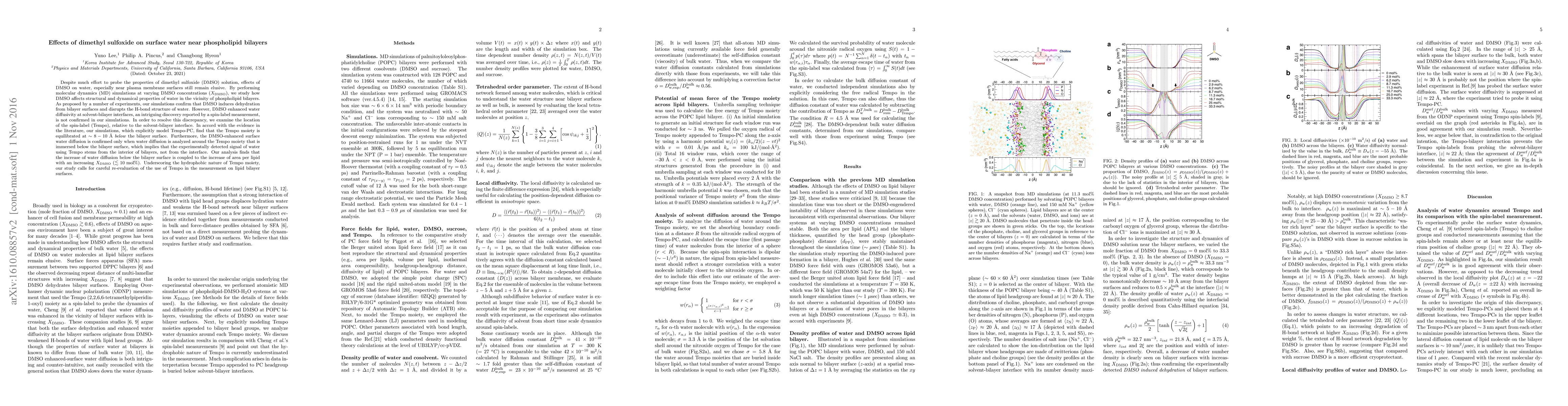 Despite much effort to probe the properties of dimethyl sulfoxide (DMSO) solution, effects of DMSO on water, especially near plasma membrane surfaces still remain elusive. By performing molecular dynamics (MD) simulations at varying DMSO concentrations ($X_{\text{DMSO}}$), we study how DMSO affects structural and dynamical properties of water in the vicinity of phospholipid bilayers. As proposed by a number of experiments, our simulations confirm that DMSO induces dehydration from bilayer surfaces and disrupts the H-bond structure of water. However, DMSO enhanced water diffusivity at solvent-bilayer interfaces, an intriguing discovery reported by a spin-label measurement, is not confirmed in our simulations. In order to resolve this discrepancy, we examine the location of the spin-label (Tempo), relative to the solvent-bilayer interface. In accord with the evidence in the literature, our simulations, which explicitly model Tempo-PC, find that the Tempo moiety is equilibrated at $\sim 8-10$ \AA\ \emph{below} the bilayer surface. Furthermore, the DMSO-enhanced surface water diffusion is confirmed only when water diffusion is analyzed around the Tempo moiety that is immersed below the bilayer surface, which implies that the experimentally detected signal of water using Tempo stems from the interior of bilayers, not from the interface. Our analysis finds that the increase of water diffusion below the bilayer surface is coupled to the increase of area per lipid with an increasing $X_{\text{DMSO}}$ $(\lesssim 10\text{ mol\%})$. Underscoring the hydrophobic nature of Tempo moiety, our study calls for careful re-evaluation of the use of Tempo in the measurement on lipid bilayer surfaces.