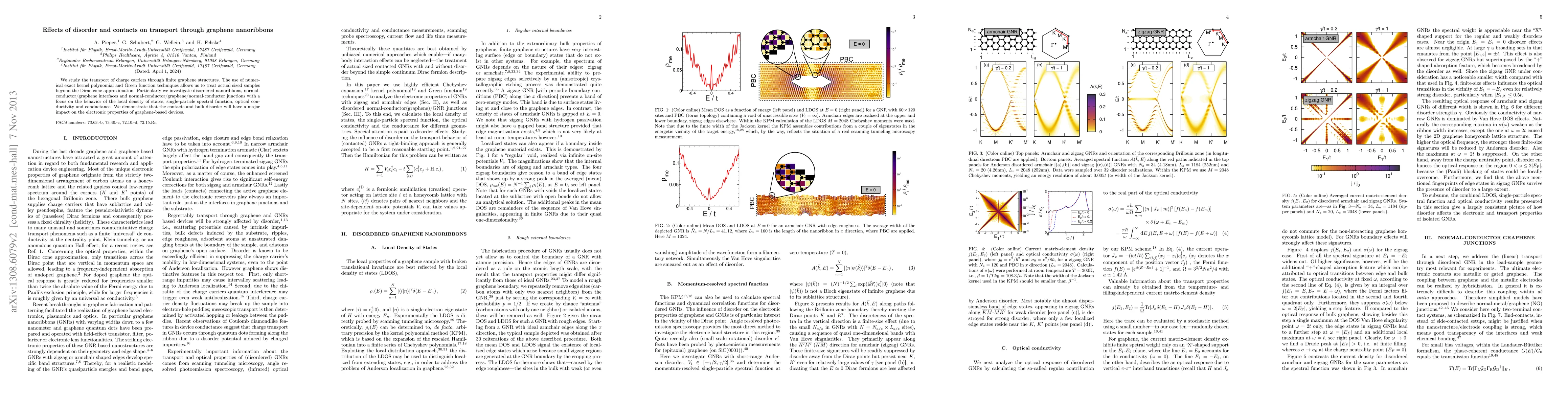 We study the transport of charge carriers through finite graphene structures. The use of numerical exact kernel polynomial and Green function techniques allows us to treat actual sized samples beyond the Dirac-cone approximation. Particularly we investigate disordered nanoribbons, normal-conductor/graphene interfaces and normal-conductor/graphene/normal-conductor junctions with a focus on the behavior of the local density of states, single-particle spectral function, optical conductivity and conductance. We demonstrate that the contacts and bulk disorder will have a major impact on the electronic properties of graphene-based devices.