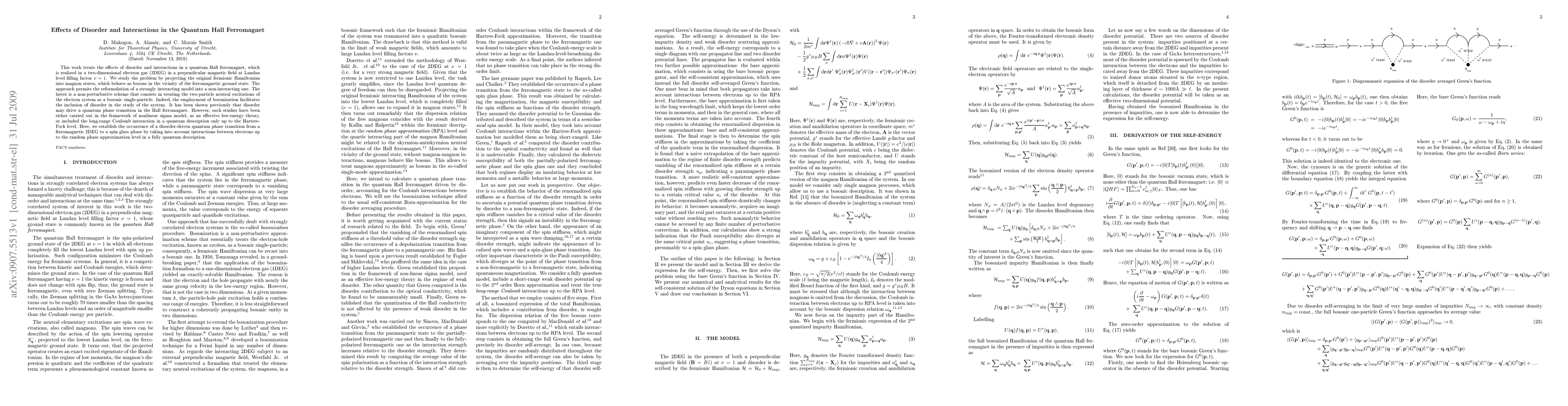 This paper investigates the effects of disorder and interactions in a quantum Hall ferromagnet, reformulating the strongly interacting electron model into a non-interacting bosonic one using bosonization. It demonstrates a disorder-driven quantum phase transition from a ferromagnetic to a spin glass phase, considering electron interactions up to the random phase approximation level.