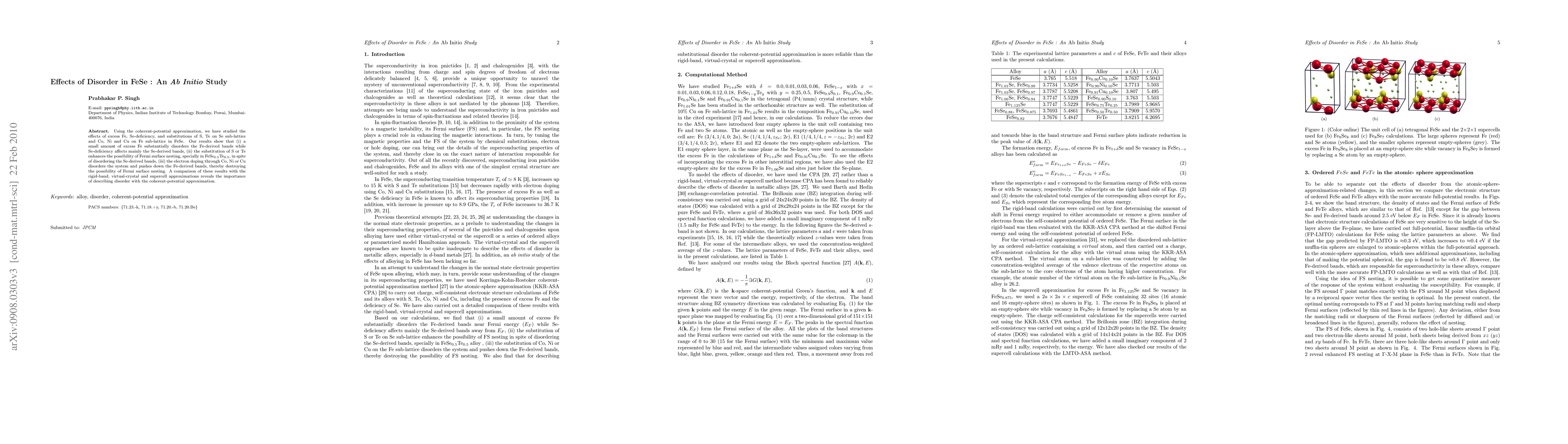 Using the coherent-potential approximation, we have studied the effects of excess Fe, Se-deficiency, and substitutions of S, Te on Se sub-lattice and Co, Ni and Cu on Fe sub-lattice in FeSe. Our results show that (i) a small amount of excess Fe substantially disorders the Fe-derived bands while Se-deficiency affects mainly the Se-derived bands, (ii) the substitution of S or Te enhances the possibility of Fermi surface nesting, specially in FeSe$_{0.5}$Te$_{0.5}$, in spite of disordering the Se-derived bands, (iii) the electron doping through Co, Ni or Cu disorders the system and pushes down the Fe-derived bands, thereby destroying the possibility of Fermi surface nesting. A comparison of these results with the rigid-band, virtual-crystal and supercell approximations reveals the importance of describing disorder with the coherent-potential approximation.
