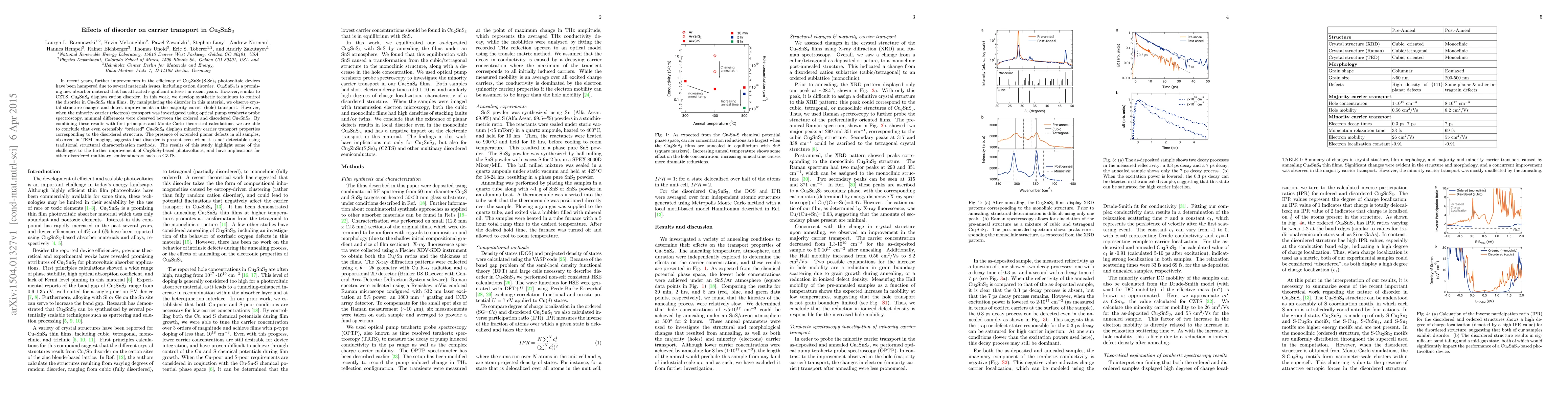 Researchers developed techniques to control disorder in Cu$_2$SnS$_3$, a promising photovoltaic material, finding improved hole transport but minimal difference in electron transport.