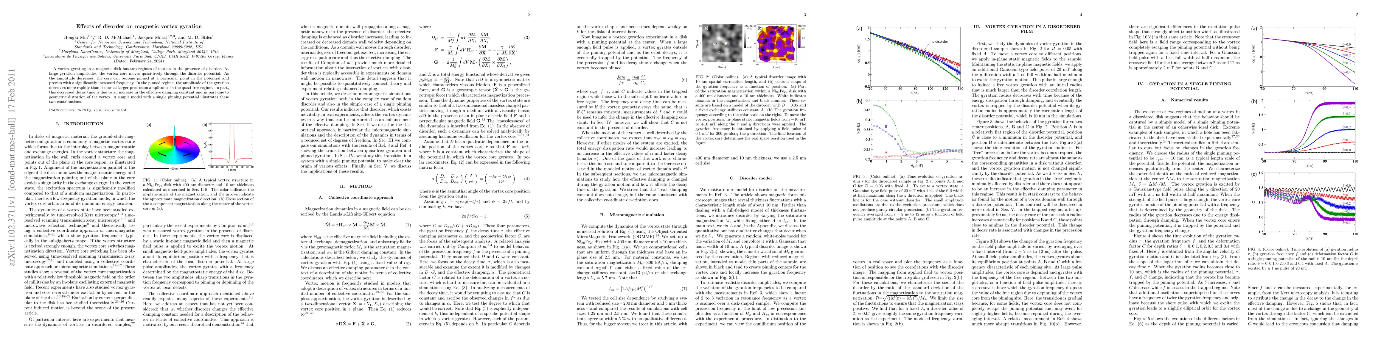 Researchers found that magnetic vortex gyration in a disk has two regimes of motion when disorder is present: one where the core moves freely and another where it becomes pinned at a point with increased frequency, leading to a rapid decrease in gyration amplitude.
