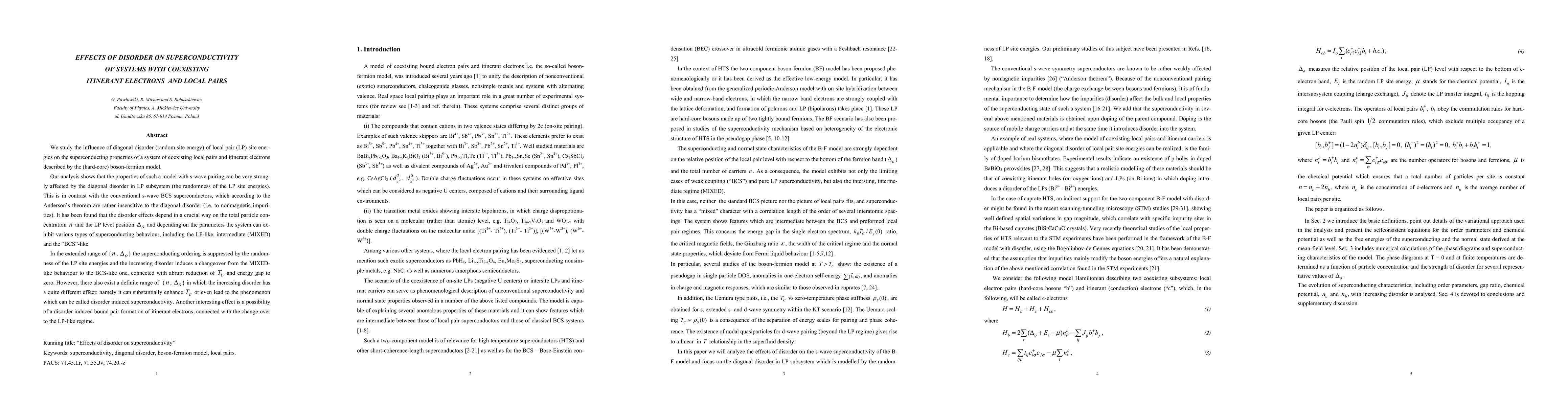 We study the influence of diagonal disorder (random site energy) of local pair (LP) site energies on the superconducting properties of a system of coexisting local pairs and itinerant electrons described by the (hard-core) boson-fermion model. Our analysis shows that the properties of such a model with s-wave pairing can be very strongly affected by the diagonal disorder in LP subsystem (the randomness of the LP site energies). This is in contrast with the conventional s-wave BCS superconductors, which according to the Anderson's theorem are rather insensitive to the diagonal disorder (i.e. to nonmagnetic impurities). It has been found that the disorder effects depend in a crucial way on the total particle concentration n and the LP level position DELTA_o and depending on the parameters the system can exhibit various types of superconducting behaviour, including the LP-like, intermediate (MIXED)and the 'BCS'-like. In the extended range of {n,DELTA_o} the superconducting ordering is suppressed by the randomness of the LP site energies and the increasing disorder induces a changeover from the MIXEDlike behaviour to the BCS-like one, connected with abrupt reduction of T_c and energy gap to zero. However, there also exist a definite range of {n,DELTA_o} in which the increasing disorder has a quite different effect: namely it can substantially enhance T_c or even lead to the phenomenon which can be called disorder induced superconductivity. Another interesting effect is a possibility of a disorder induced bound pair formation of itinerant electrons, connected with the change-over to the LP-like regime.