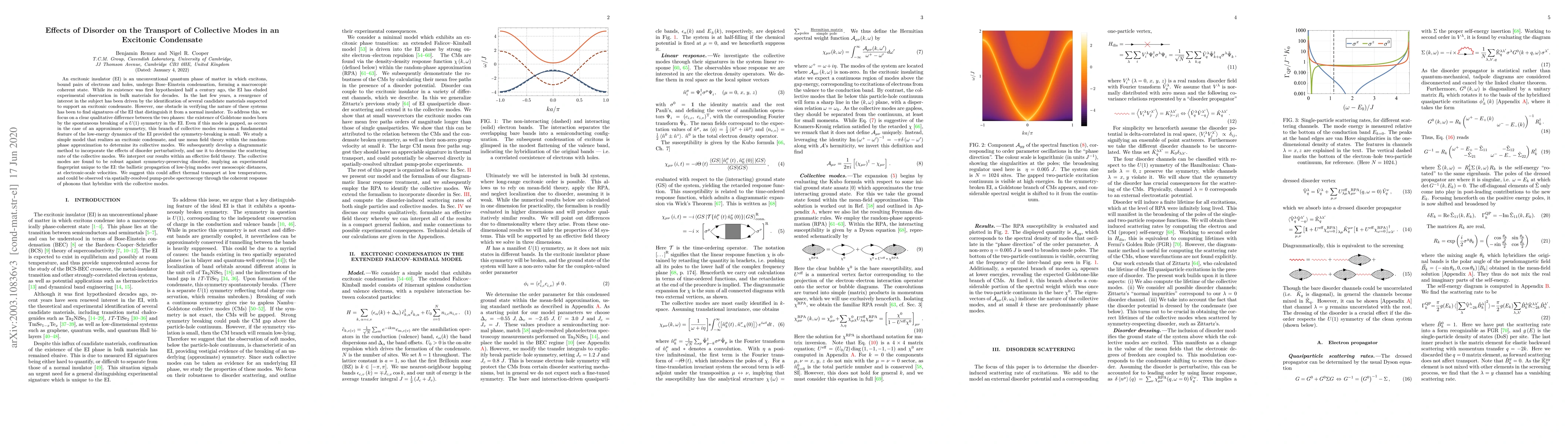 An excitonic insulator (EI) is an unconventional quantum phase of matter in which excitons, bound pairs of electrons and holes, undergo Bose--Einstein condensation, forming a macroscopic coherent state. While its existence was first hypothesized half a century ago, the EI has eluded experimental observation in bulk materials for decades. In the last few years, a resurgence of interest in the subject has been driven by the identification of several candidate materials suspected to support an excitonic condensate. However, one obstacle in verifying the nature of these systems has been to find signatures of the EI that distinguish it from a normal insulator. To address this, we focus on a clear qualitative difference between the two phases: the existence of Goldstone modes born by the spontaneous breaking of a $U(1)$ symmetry in the EI. Even if this mode is gapped, as occurs in the case of an approximate symmetry, this branch of collective modes remains a fundamental feature of the low-energy dynamics of the EI provided the symmetry-breaking is small. We study a simple model that realizes an excitonic condensate, and use mean field theory within the random-phase approximation to determine its collective modes. We subsequently develop a diagrammatic method to incorporate the effects of disorder perturbatively, and use it to determine the scattering rate of the collective modes. We interpret our results within an an effective field theory. The collective modes are found to be robust against symmetry-preserving disorder, implying an experimental fingerprint unique to the EI: the ballistic propagation of low-lying modes over mesoscopic distances, at electronic-scale velocities. We suggest this could affect thermal transport at low temperatures, and could be observed via spatially-resolved pump-probe spectroscopy through the coherent response of phonons that hybridize with the collective modes.