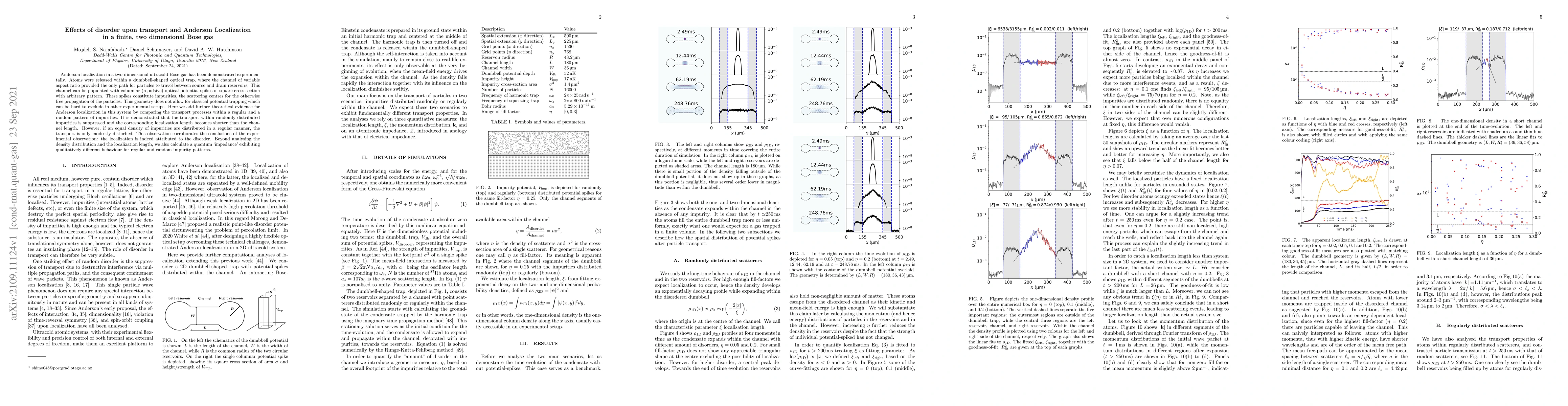 Anderson localization in a two-dimensional ultracold Bose-gas has been demonstrated experimentally. Atoms were released within a dumbbell-shaped optical trap, where the channel of variable aspect ratio provided the only path for particles to travel between source and drain reservoirs. This channel can be populated with columnar (repulsive) optical potential spikes of square cross section with arbitrary pattern. These spikes constitute impurities, the scattering centres for the otherwise free propagation of the particles. This geometry does not allow for classical potential trapping which can be hard to exclude in other experimental setups. Here we add further theoretical evidence for Anderson localization in this system by comparing the transport processes within a regular and a random pattern of impurities. It is demonstrated that the transport within randomly distributed impurities is suppressed and the corresponding localization length becomes shorter than the channel length. However, if an equal density of impurities are distributed in a regular manner, the transport is only modestly disturbed. This observation corroborates the conclusions of the experimental observation: the localization is indeed attributed to the disorder. Beyond analysing the density distribution and the localization length, we also calculate a quantum `impedance' exhibiting qualitatively different behaviour for regular and random impurity patterns.