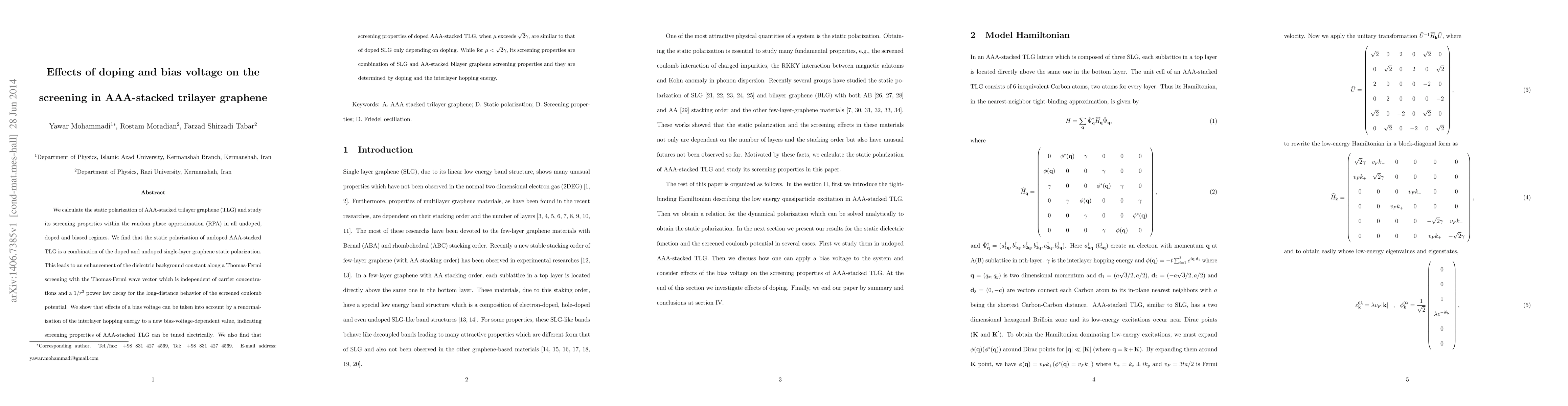 This paper investigates the static polarization and screening effects in AAA-stacked trilayer graphene under various doping and bias voltage conditions. It finds that the dielectric background constant and the screening behavior can be tuned electrically via bias voltage, with distinct screening properties depending on doping levels and interlayer hopping energy.