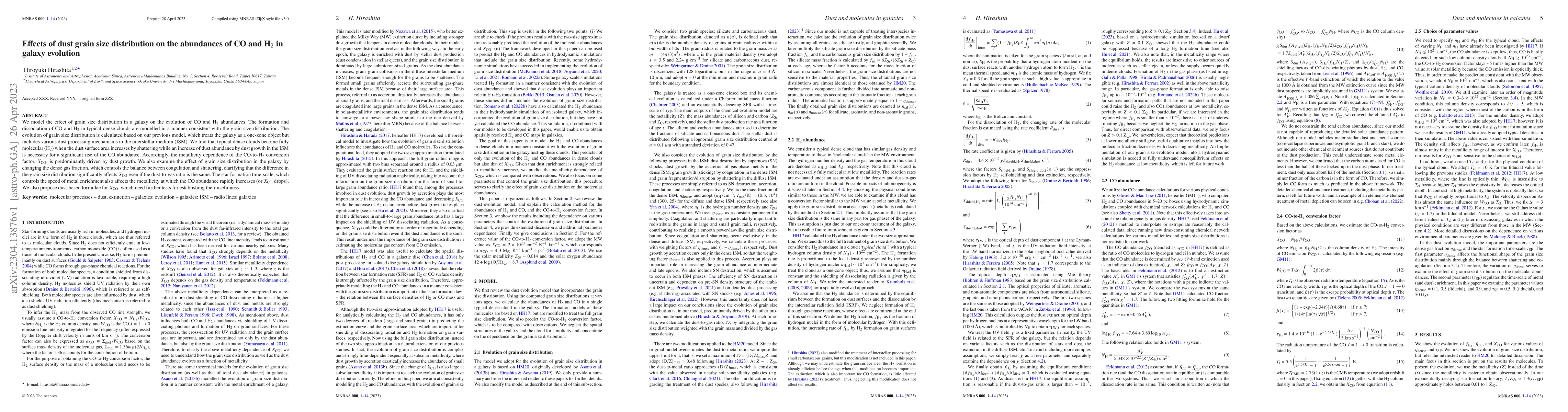 This paper models the impact of dust grain size distribution on the evolution of CO and H$_2$ abundances in galaxies, finding that grain size affects the conversion factor $X_\mathrm{CO}$ through dust growth and processing mechanisms. It concludes that dust growth is crucial for increasing CO abundance, while shattering increases H$_2$ abundance, and proposes dust-based formulae for $X_\mathrm{CO}$ requiring further validation.