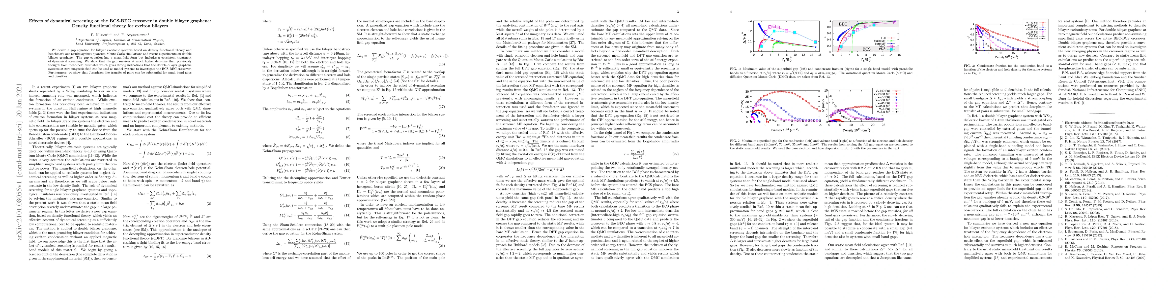 We derive a gap equation for bilayer excitonic systems based on density functional theory and benchmark our results against quantum Monte-Carlo simulations and recent experiments on double bilayer graphene. The gap equation has a mean-field form but includes a consistent treatment of dynamical screening. We show that the gap survives at much higher densities than previously thought from mean-field estimates which gives strong indications that the double-bilayer graphene systems at zero magnetic field can be used as model systems to investigate the BCS-BEC crossover. Furthermore, we show that Josephson-like transfer of pairs can be substantial for small band gaps and densities.