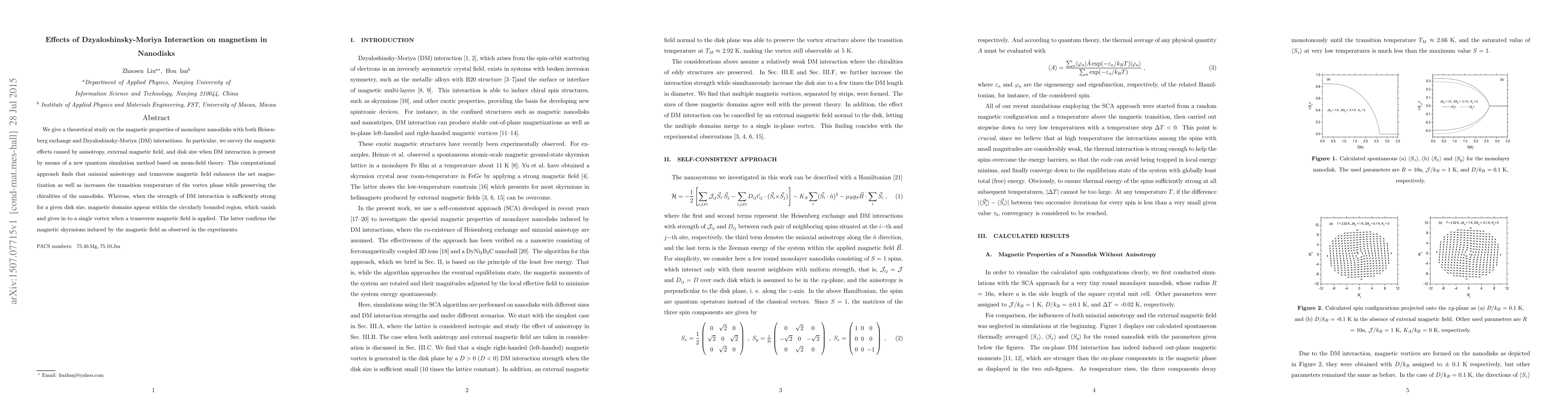 We give a theoretical study on the magnetic properties of monolayer nanodisks with both Heisenberg exchange and Dzyaloshinsky-Moriya (DM) interactions. In particular, we survey the magnetic effects caused by anisotropy, external magnetic field, and disk size when DM interaction is present by means of a new quantum simulation method based on mean-field theory. This computational approach finds that uniaxial anisotropy and transverse magnetic field enhances the net magnetization as well as increases the transition temperature of the vortex phase while preserving the chiralities of the nanodisks. Whereas, when the strength of DM interaction is sufficiently strong for a given disk size, magnetic domains appear within the circularly bounded region, which vanish and gives in to a single vortex when a transverse magnetic field is applied. The latter confirms the magnetic skyrmions induced by the magnetic field as observed in the experiments.