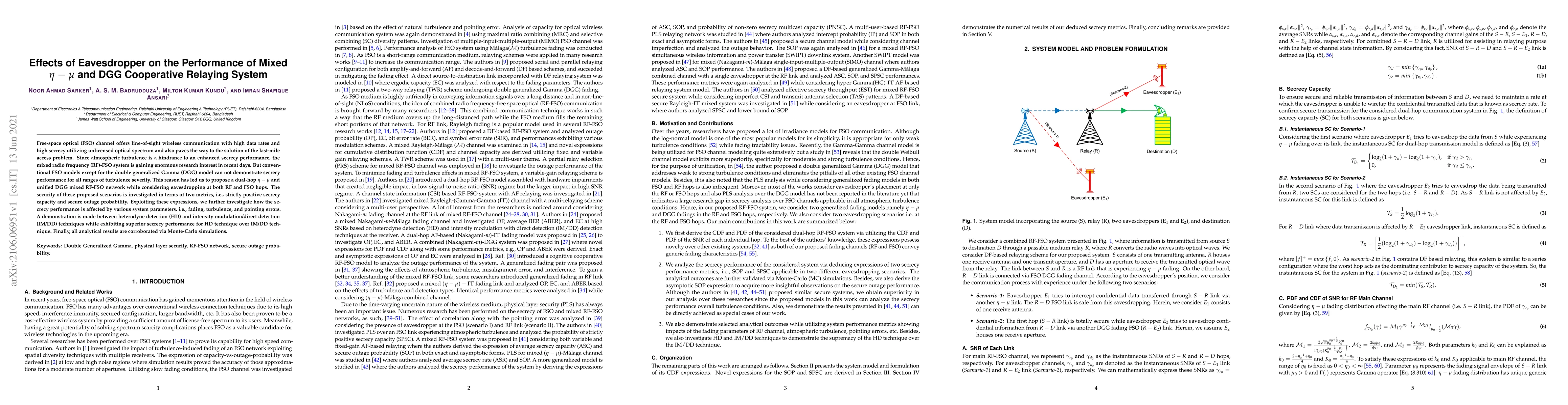 This paper investigates the impact of eavesdropping on the performance of a mixed RF-FSO cooperative relaying system, proposing a dual-hop eta-mu and unified DGG model to enhance secrecy in varying turbulence conditions. The study evaluates security metrics like strictly positive secrecy capacity and secure outage probability, demonstrating superior secrecy performance of the heterodyne detection technique over intensity modulation and direct detection.