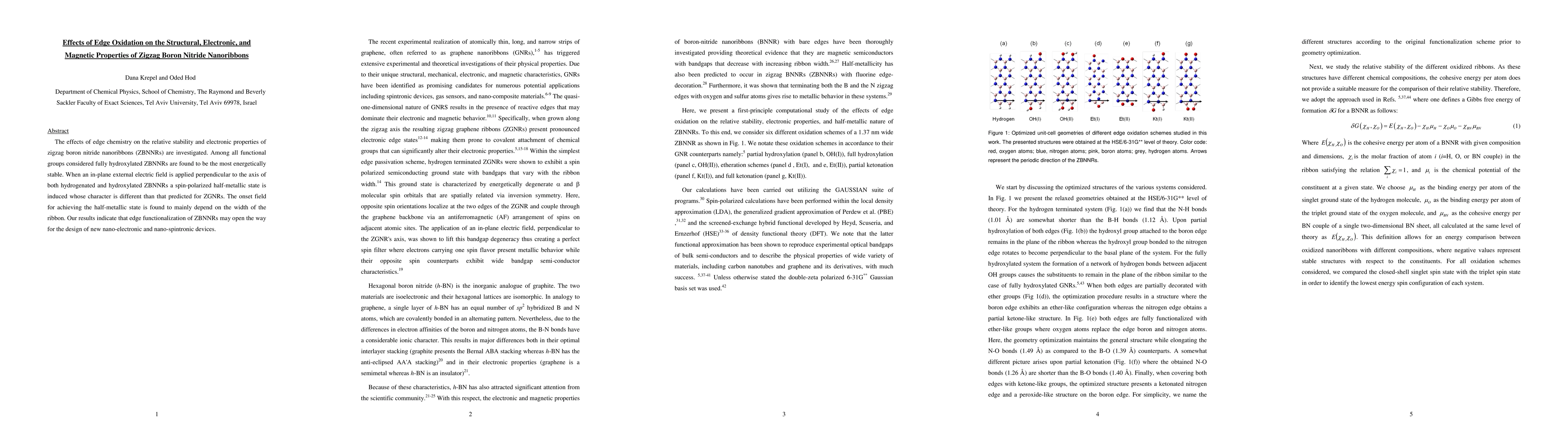 This study investigates how edge oxidation affects the stability, electronic, and magnetic properties of zigzag boron nitride nanoribbons (ZBNNRs). Fully hydroxylated ZBNNRs are the most stable, and an external electric field induces a spin-polarized half-metallic state, differing from that in ZGNRs, with the onset field depending on ribbon width, suggesting potential for new nano-devices.