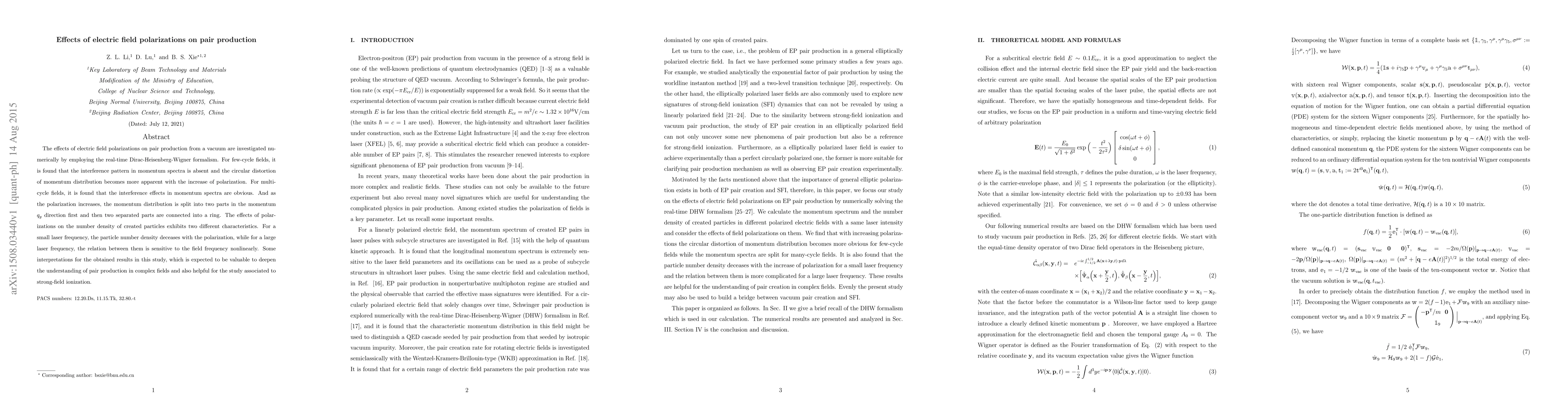 This study numerically investigates how electric field polarization affects vacuum pair production using the Dirac-Heisenberg-Wigner formalism. It reveals distinct interference patterns and momentum distributions for few-cycle versus multi-cycle fields, with polarization influencing particle number density differently based on laser frequency.