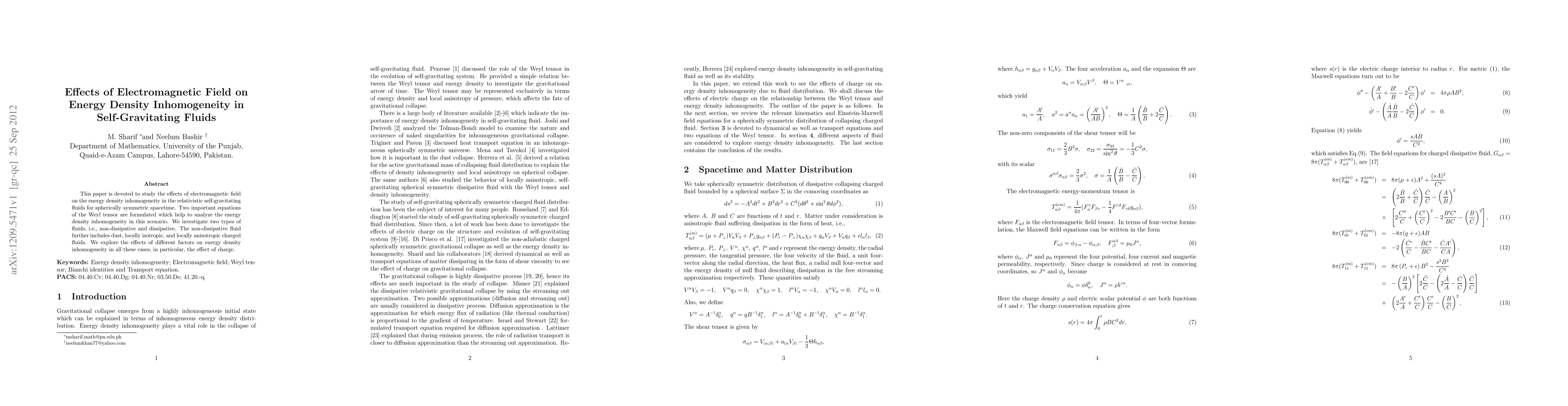 This paper examines the influence of electromagnetic fields on energy density inhomogeneity in relativistic self-gravitating fluids within spherically symmetric spacetime, formulating key Weyl tensor equations. It investigates both non-dissipative and dissipative fluids, with a focus on the impact of charge on energy density variations.