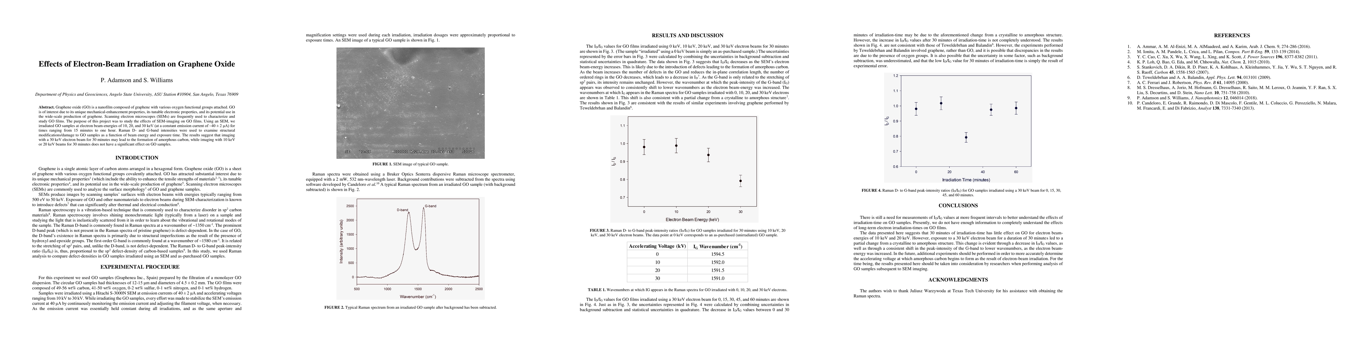 Detailed analysis of electron-beam irradiation effects on graphene oxide, providing insights into structural changes and their correlation with beam energy and exposure time.